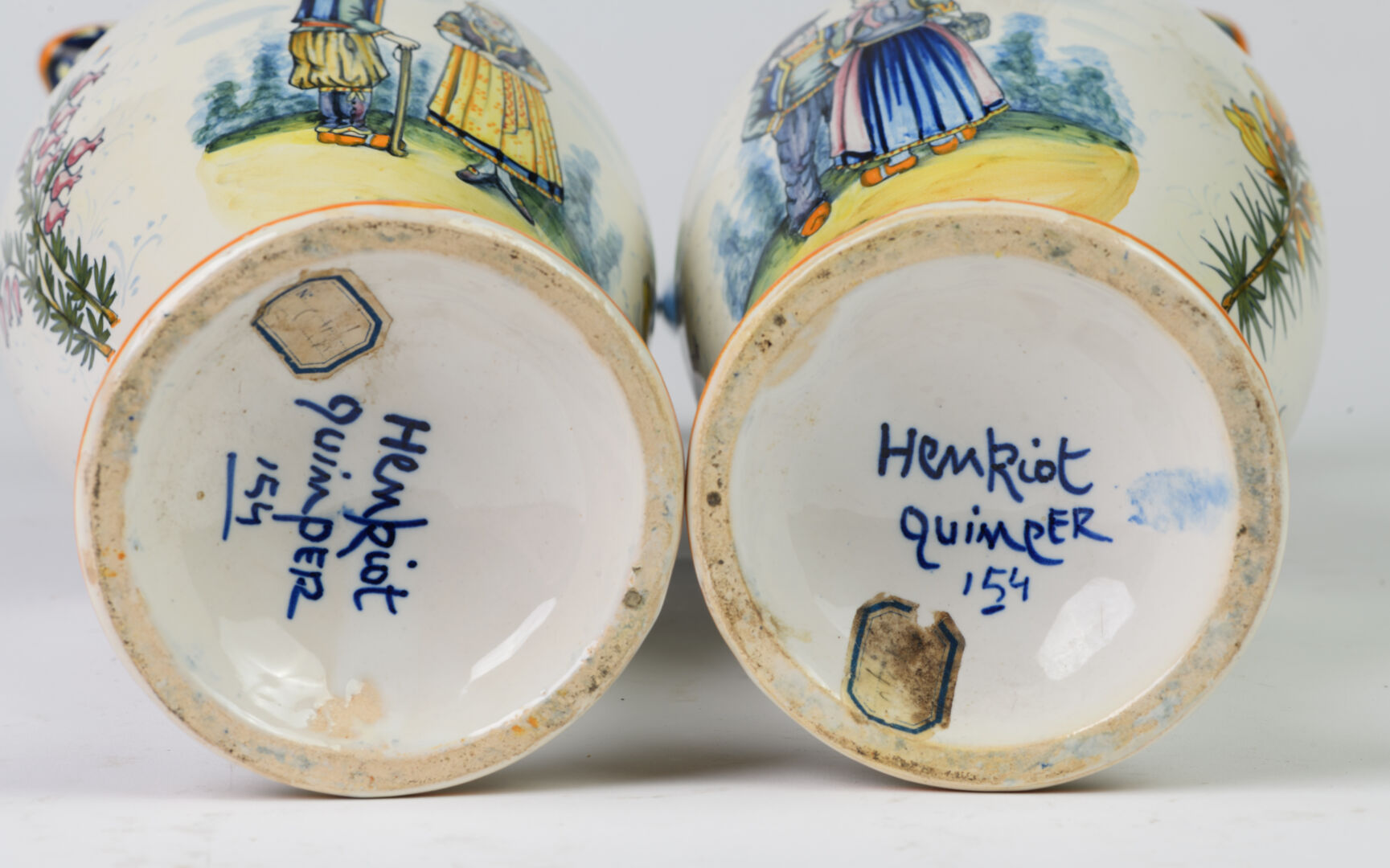 Manufacture HENRIOT - QUIMPER Paire d'aiguières sur piédouche en faïence émaillée à décor floral et de couples de danseurs, les anses soulignées de bleuSignées sous la base et numérotées 154H : 45 cm