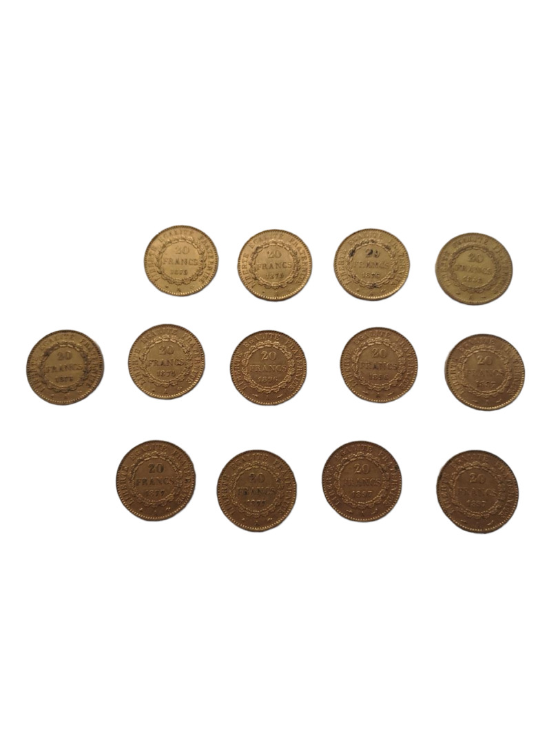 Lot de soixante-huit pièces de 20 francs en or 750 millièmes : - deux à l'effigie de Cérès, datées 1851. - vingt-deux à l'effigie de Marianne (1 x 1902, 2 x 1905, 3 x 1906, 7 x 1907, 5 x 1909, 1 x 1910, 2 x 1911, 1 x 1914) - treize à l'effigie du génie (1 x 1848, 1 x 1874, 3 x 1875, 1 x 1876, 2 x 1877, 1 x 1887, 2 x 1896, 2 x 1897) - sept à l'effigie de Napoléon III tête laurée (1 x 1863, 1 x 1864, 2 x 1866, 2 x 1868, 1 x 1869) - vingt-quatre à l'effigie de Napoléon III tête nue (3 x 1853, 2 x 1854, 1 x 1855, 2 x 1856, 5 x 1857, 3 x 1858, 4 x 1859, 4 x 1860) Poids total : 437 g