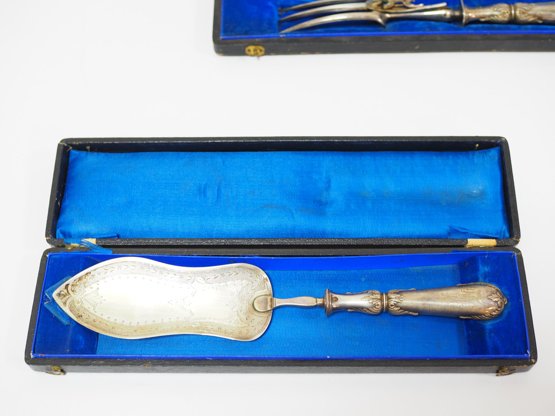 Pelle en argent. Poinçon Minerve. Poids brut : 112 g On y joint des couverts de service en métal argenté (manques), sucrier en métal argenté style Louis XVI, un rond de serviette, un manche à gigot en métal argenté, une bonbonnière avec couvercle surmonté d'une figure de bovin et un plat en métal argenté.