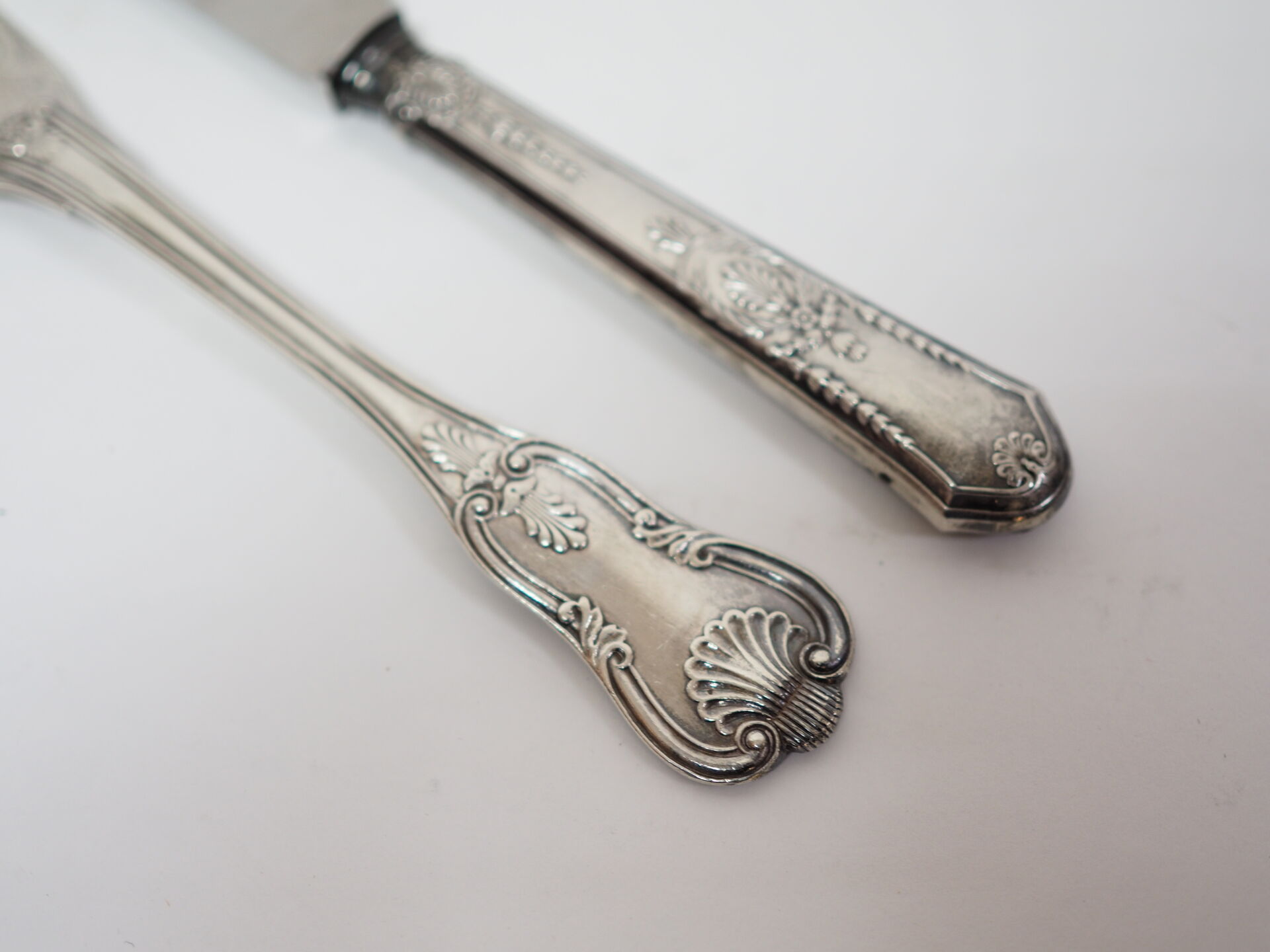Paire de couverts : fourchette en argent à décor coquille et couteau en argent fourré à décor néo-classique et lame du couteau en inox. Poinçon Minerve. Poids total brut : 167 g
