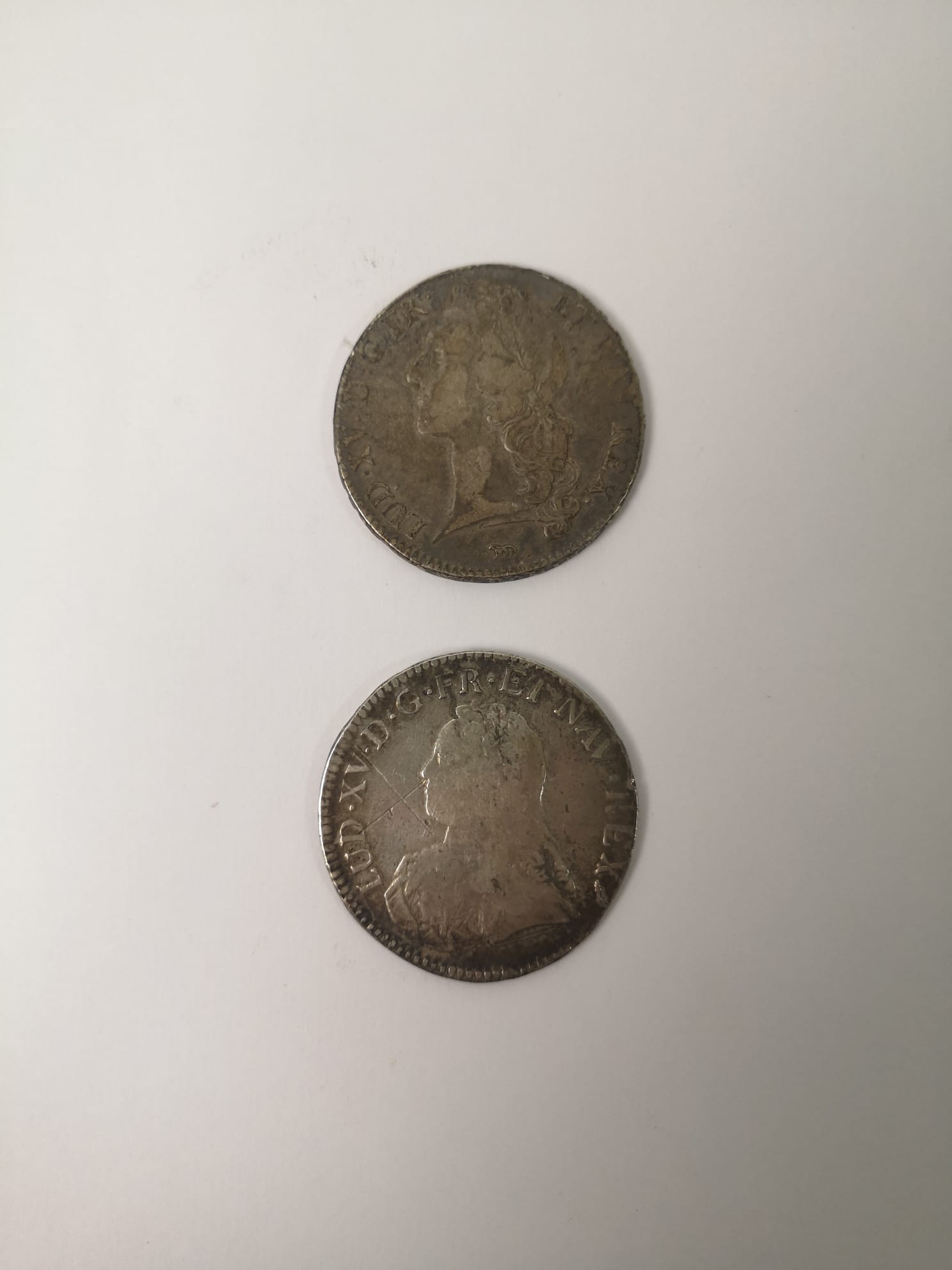 Lot de pièces anciennes dont : - un demi-écu aux lauriers de Louis XV. (1726). A/ LUD XV D G FR ET NAV REX. (Louis XV, par la grâce de Dieu roi de France et de Navarre). Buste cuirassé de Louis XIV à gauche, la poitrine ornée de la croix et du cordon du Saint Esprit. R/ SIT NOMEN DOMINI BENEDICTUM 1726 (Béni soit le nom du seigneur). Ecu ovale couronné entre deux branches de laurier. Dessous lettre d'atelier (P). Atelier de Dijon. Argent. - Ecu du Béarn dit " au bandeau de Louis XV (1742) - A/ Tête de Louis XV à gauche, ceinte d'un bandeau. Légende : LUD.XV.D.G.FR..ET.NAV REX R/ Écu de France ovale, couronné entre deux branches d'olivier. Légende : .SIT.NOMEN.DOMINI BENEDICTUM. Dessous lettre d'atelier (A)On y joint un lot d'assignats divers.