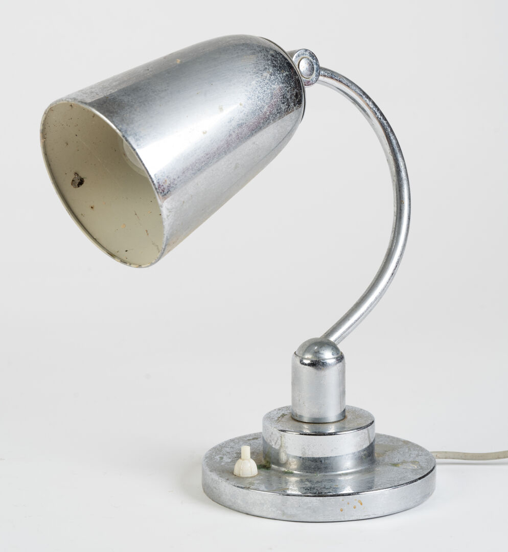 Lampe de bureau moderniste en métal chromé. Vers 1970. Rayures et oxydations. H : 32 cm ; L : 27 cm ; l : 16 cm