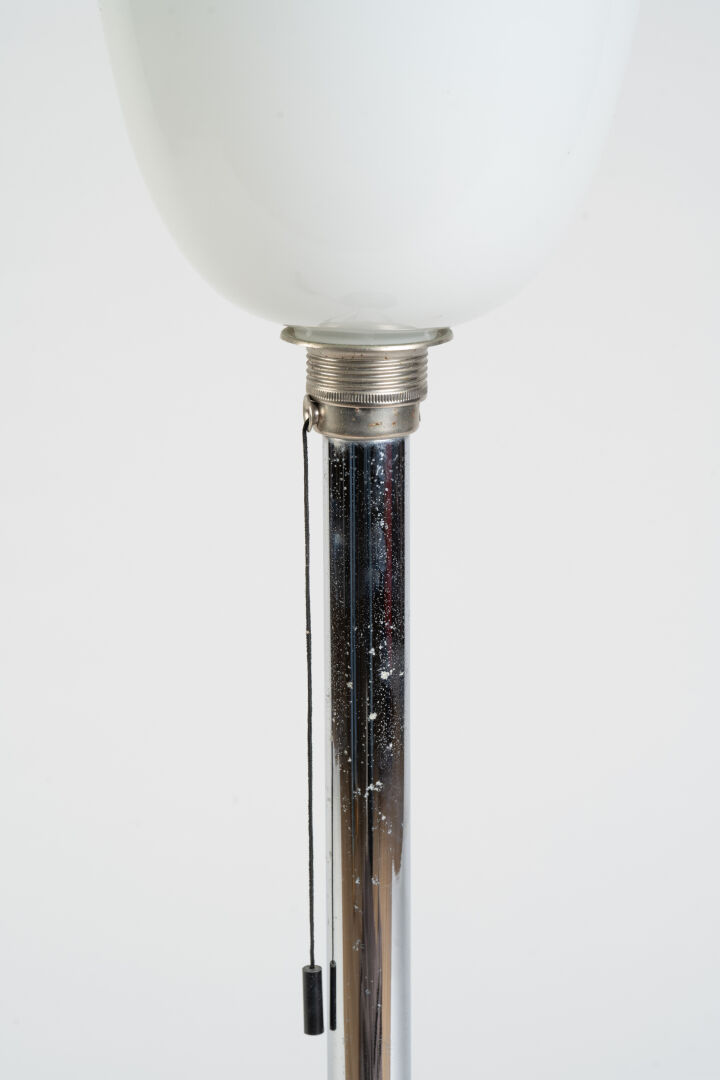 Tecnolumen, Allemagne. Lampe à pied chromé et globe opaline type "AD 30". Porte étiquette. H : 83 cm.