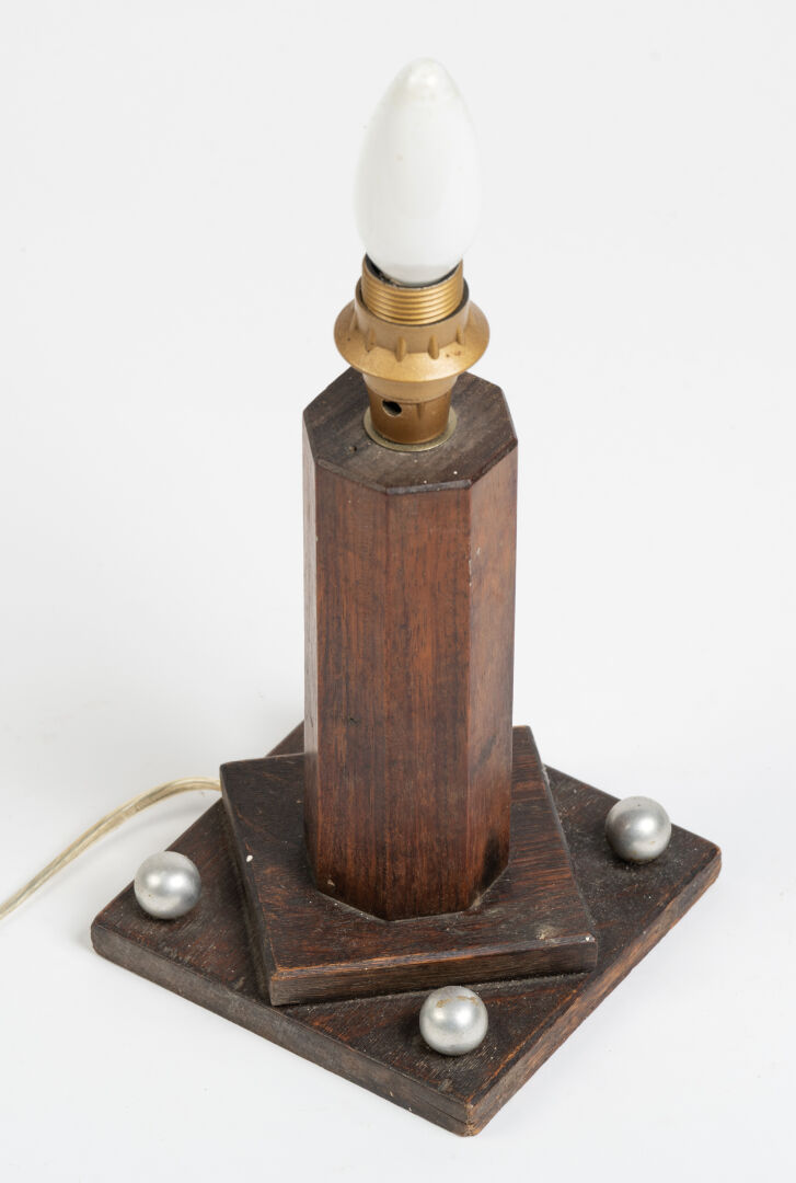 Lampe moderniste en bois. Début XXème. H : 34 cm ; L : 13,5 cm ; l : 13, 5 cm