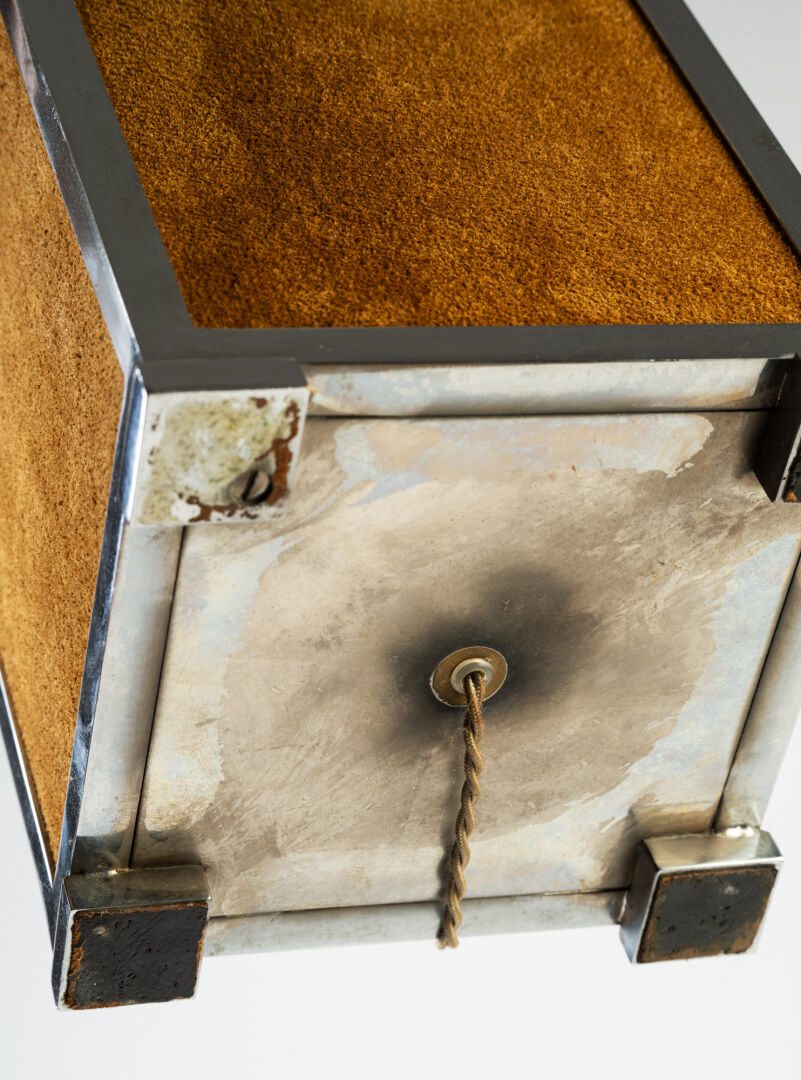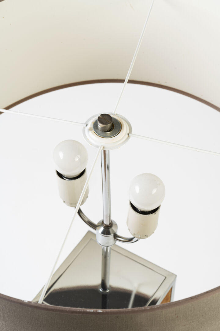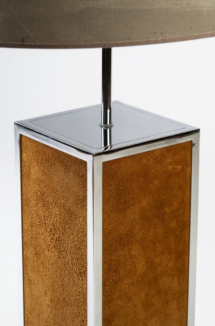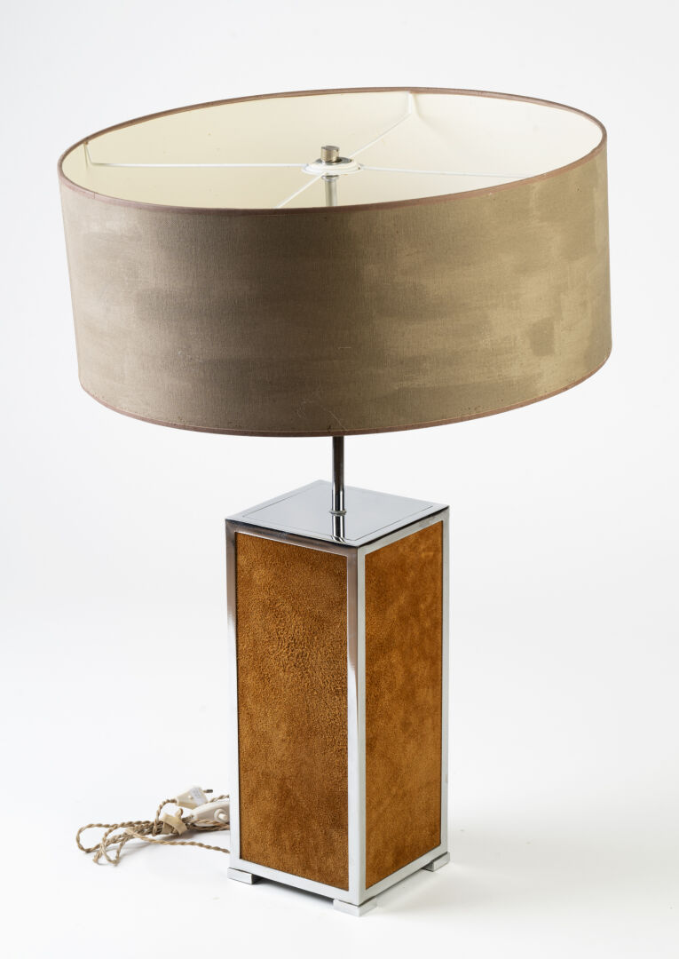 Maison Charles. Importante lampe à poser en métal chromé et suédine. Vers 1970. H : 72 cm ; D : 50 cm