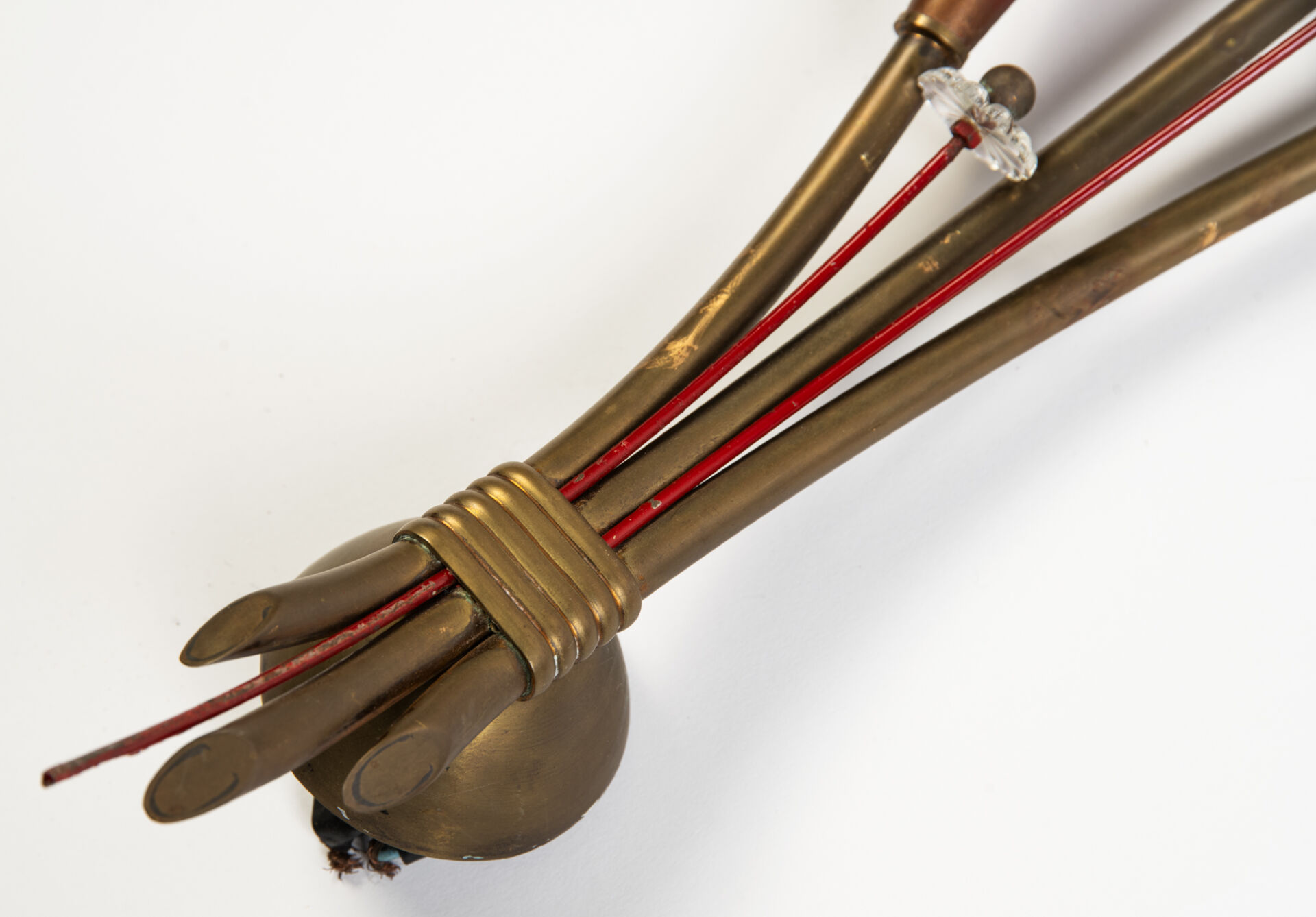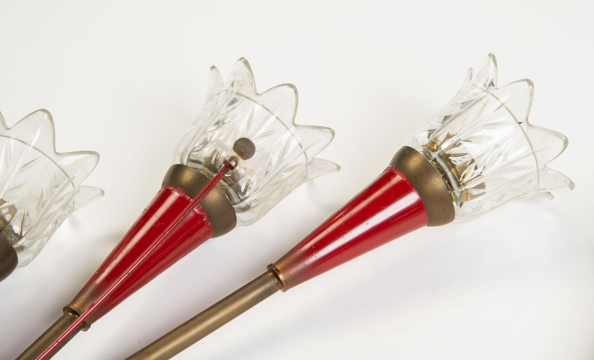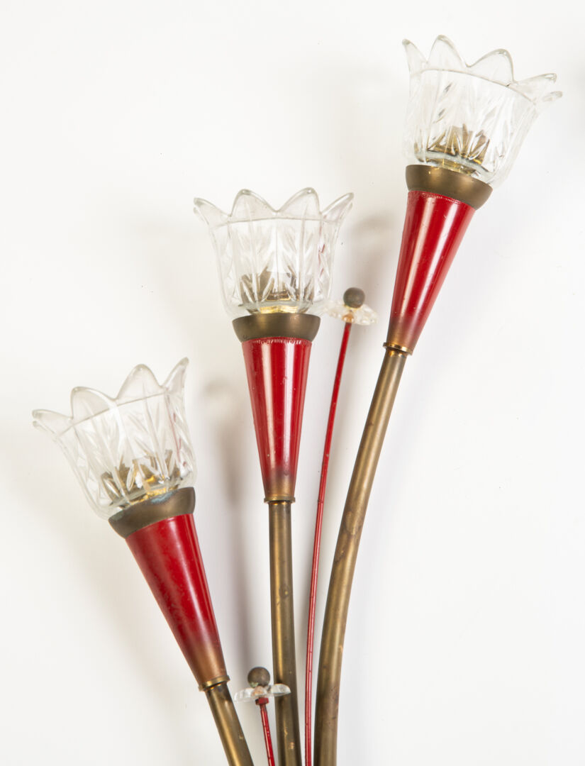 Dans le goût de la Maison de Lunel. Paire d'appliques en métal rouge et doré avec tulipes en verre. Vers 1960. H : 46 cm ; L : 24 cm ; l : 24 cm