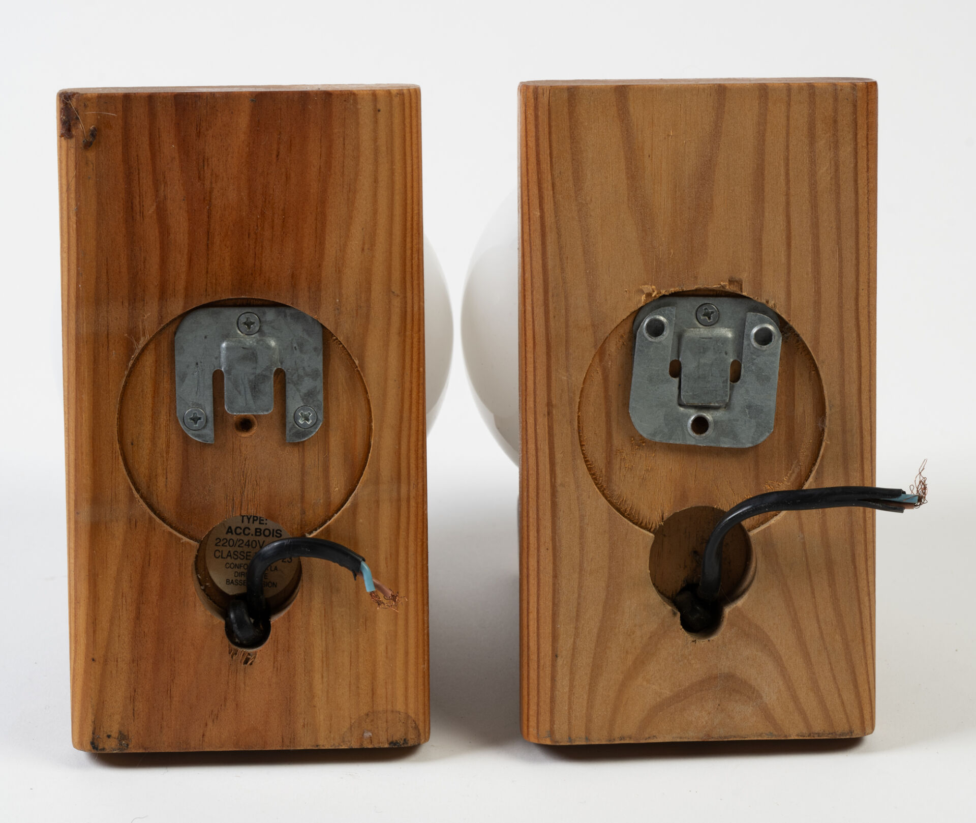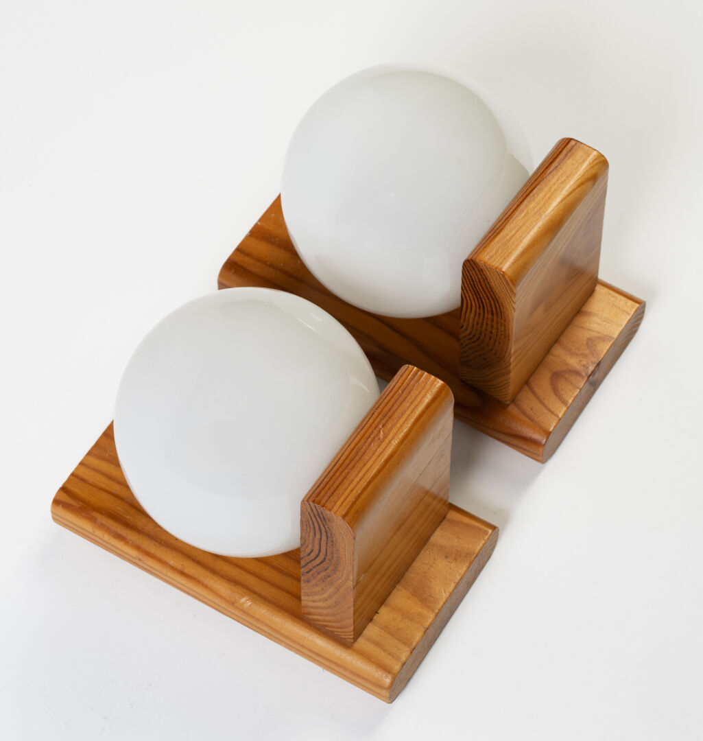 Dans le goût scandinave. Paire d'appliques en pin et globe blanc. Vers 1960. H : 18 cm ; L : 9,8 cm ; l : 14 cm