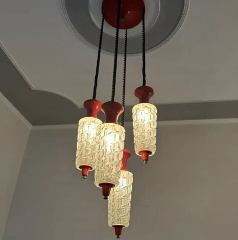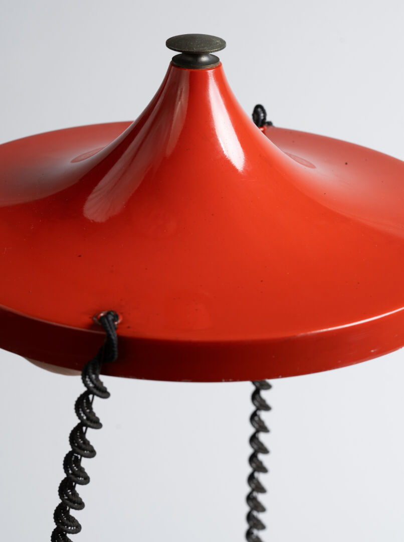 Italie. Grande suspension en cascade en métal rouge et verre. Vers 1970. H : 125 cm ; D : 33 cm