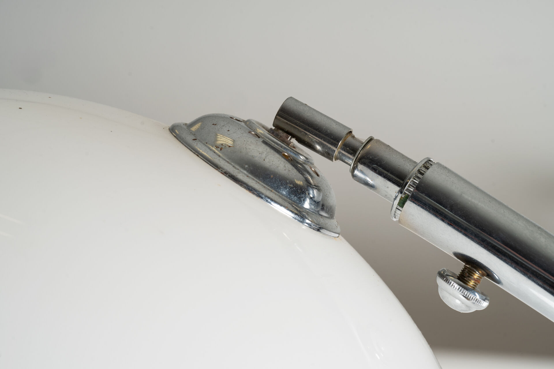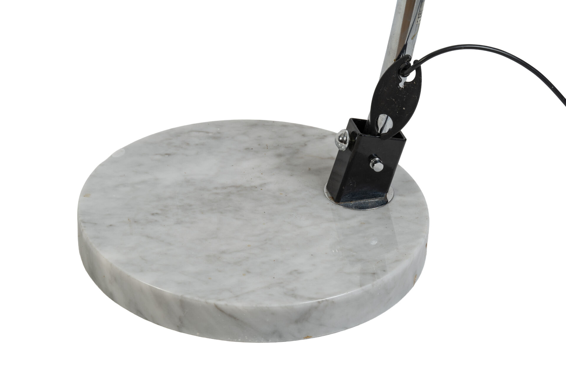 Dans le goût de Goffredo REGGIANI. Lampadaire arc en métal chromé, globe en plastique et piètement en marbre. Vers 1970. H : 180 cm ; L : 140 cm ; l : 40 cm