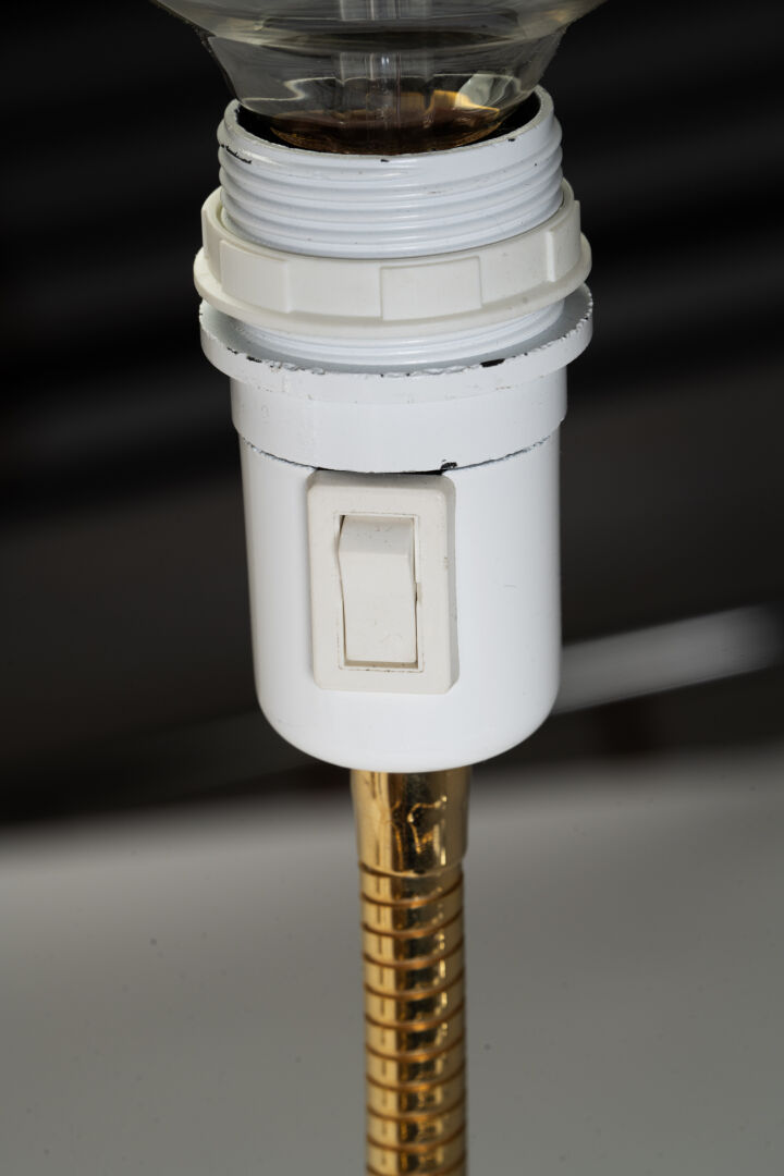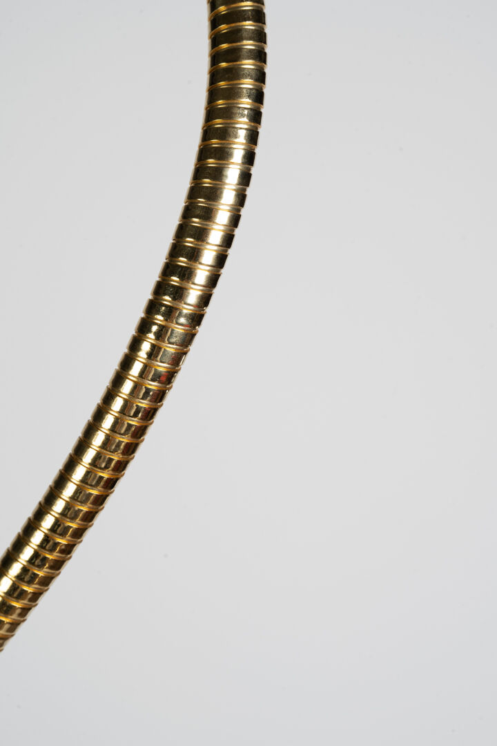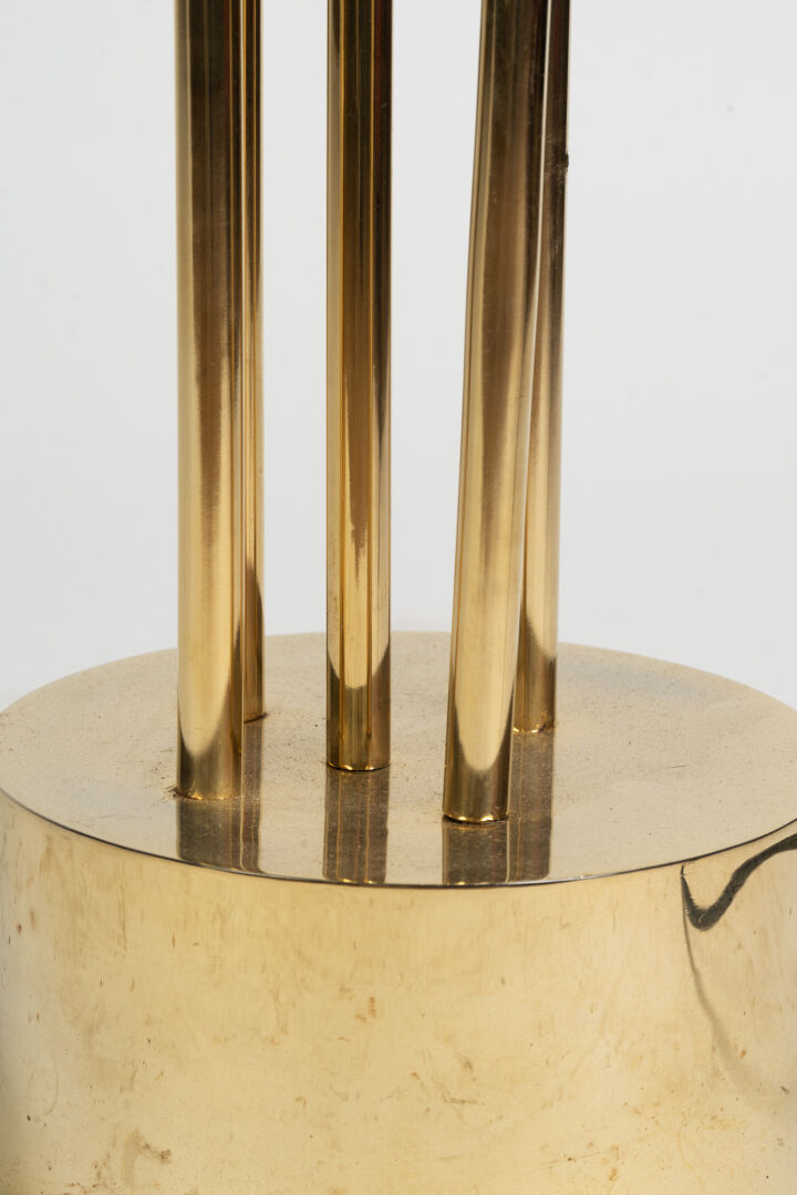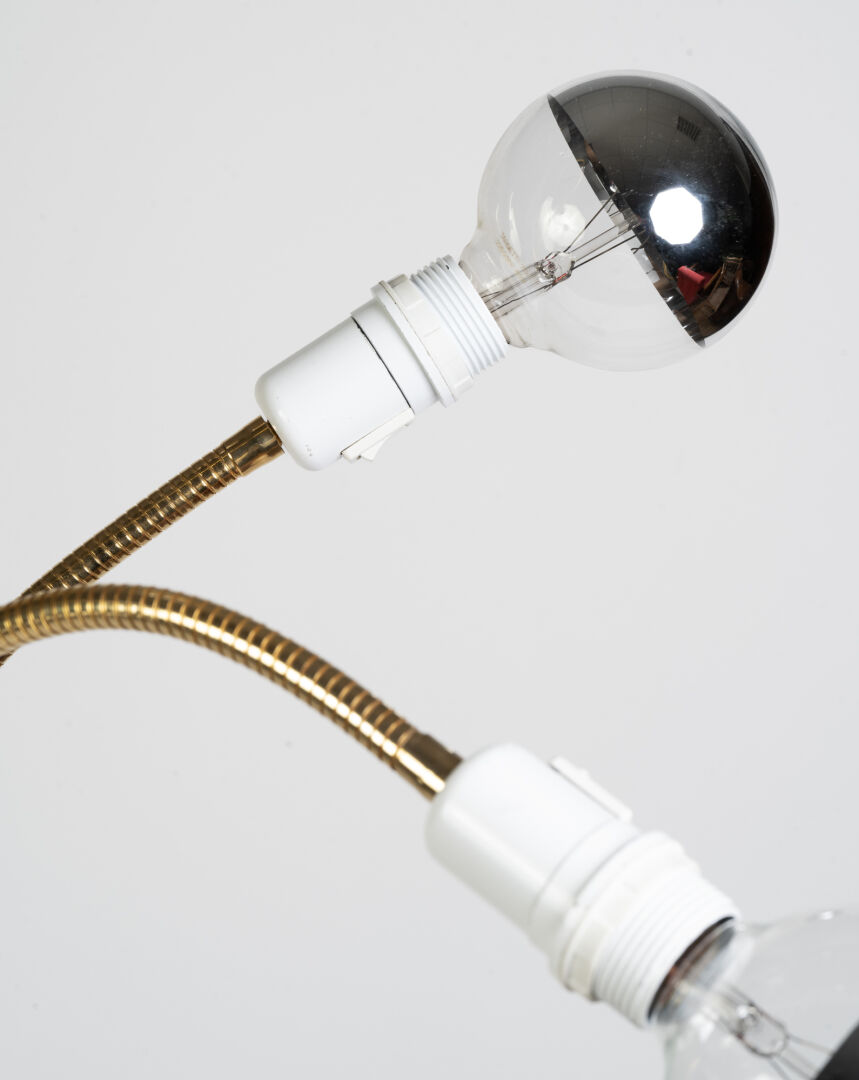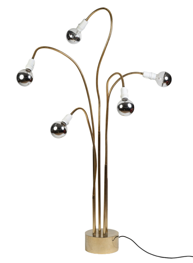 Saint-Germain Lumière (groupe Electrorama). Lampadaire modèle F415 de la série "Flexibles" en métal doré à six bras flexibles avec ampoules globes argentées Targetti. Vers 1970-1980. Ampoules d'époque neuves avec boîtes et documentations fournies. H : 180 cm ; L : 115 cm ; l : 21 cm