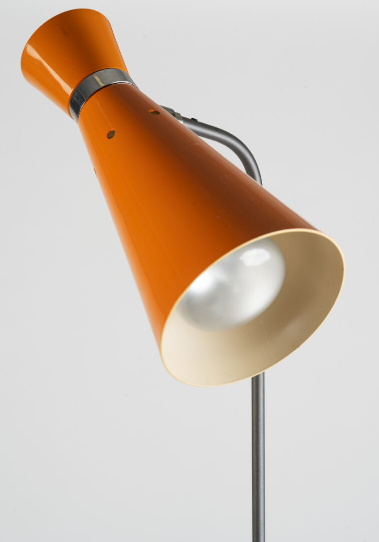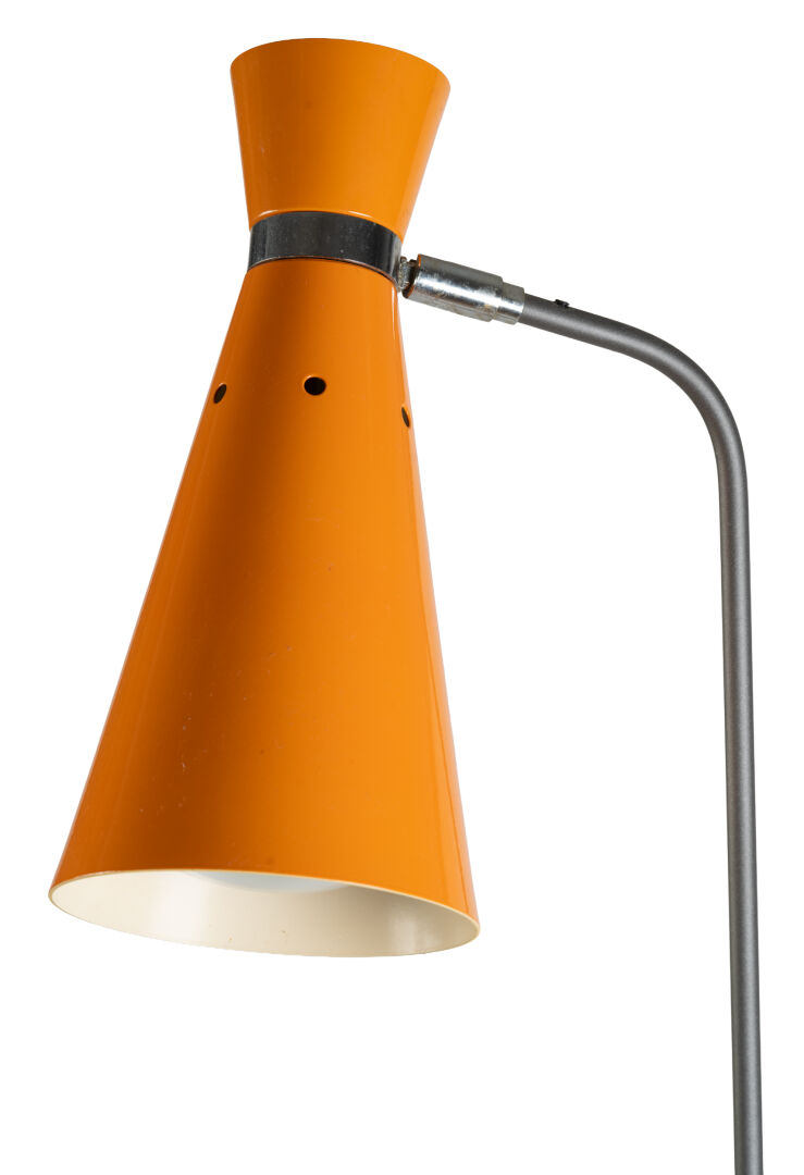 Attribué à SCE Édition. Lampadaire "diabolo" en métal orange et noir. H : 166 cm ; D : 34 cm