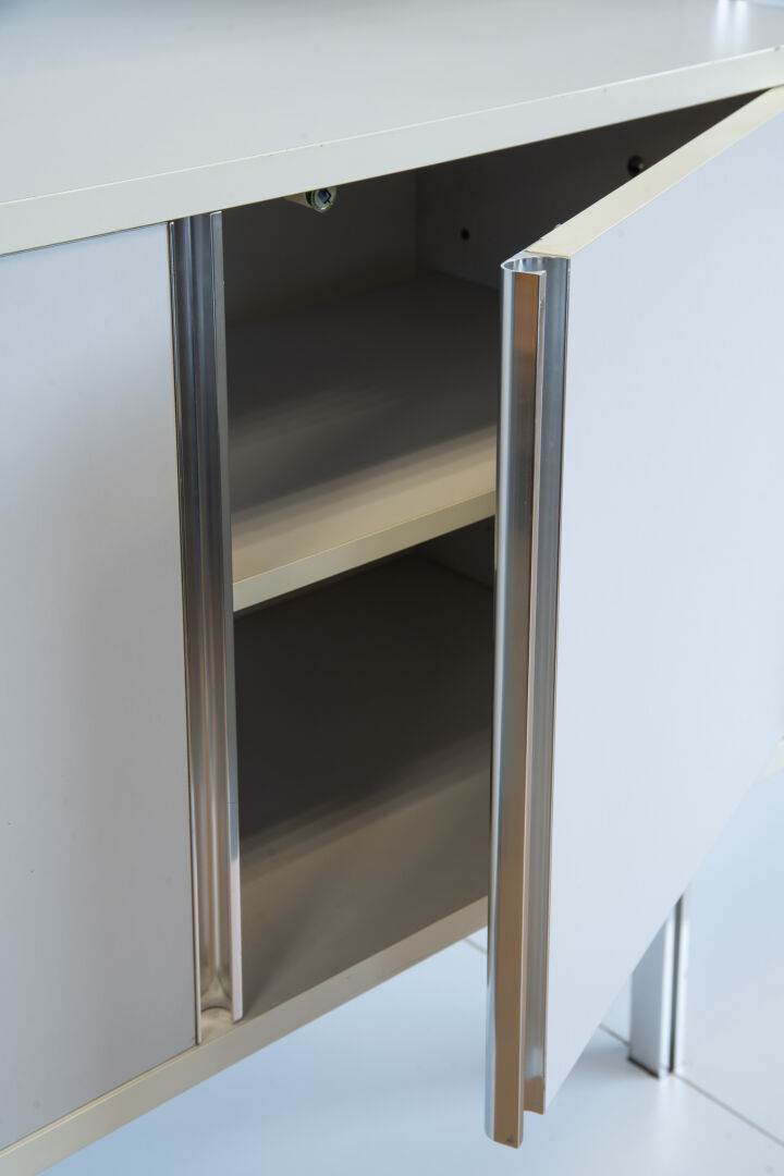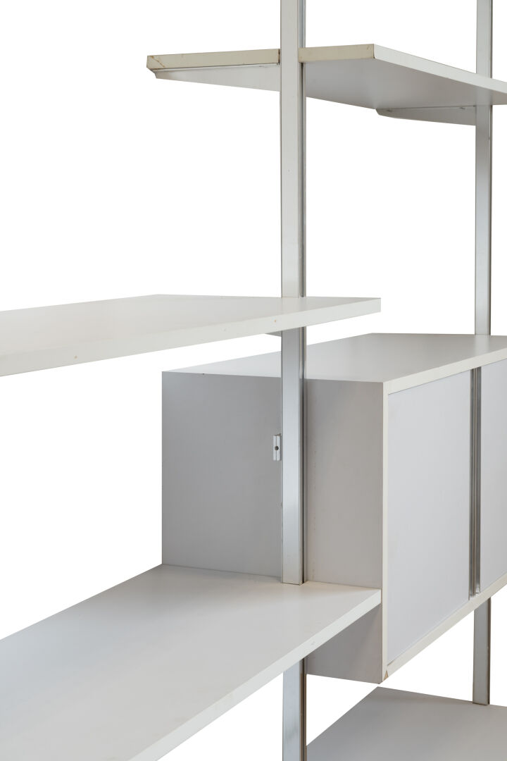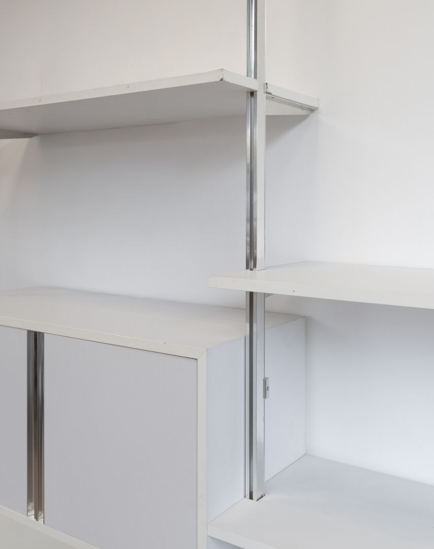Roche Bobois. Bibliothèque modulable en contreplaqué blanc et métal chromé. Vers 1970. H : 253 cm ; l : 290 cm ; P : 38 cm