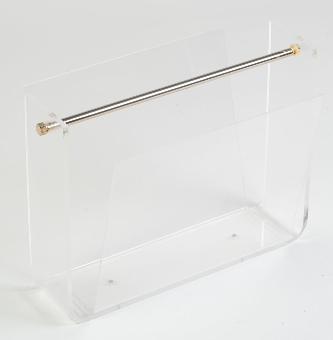 David LANGE. Porte-revues en plexiglas et laiton. Marque à la base. Légères rayures. H : 32 cm ; L : 40 cm ; l : 24 cm