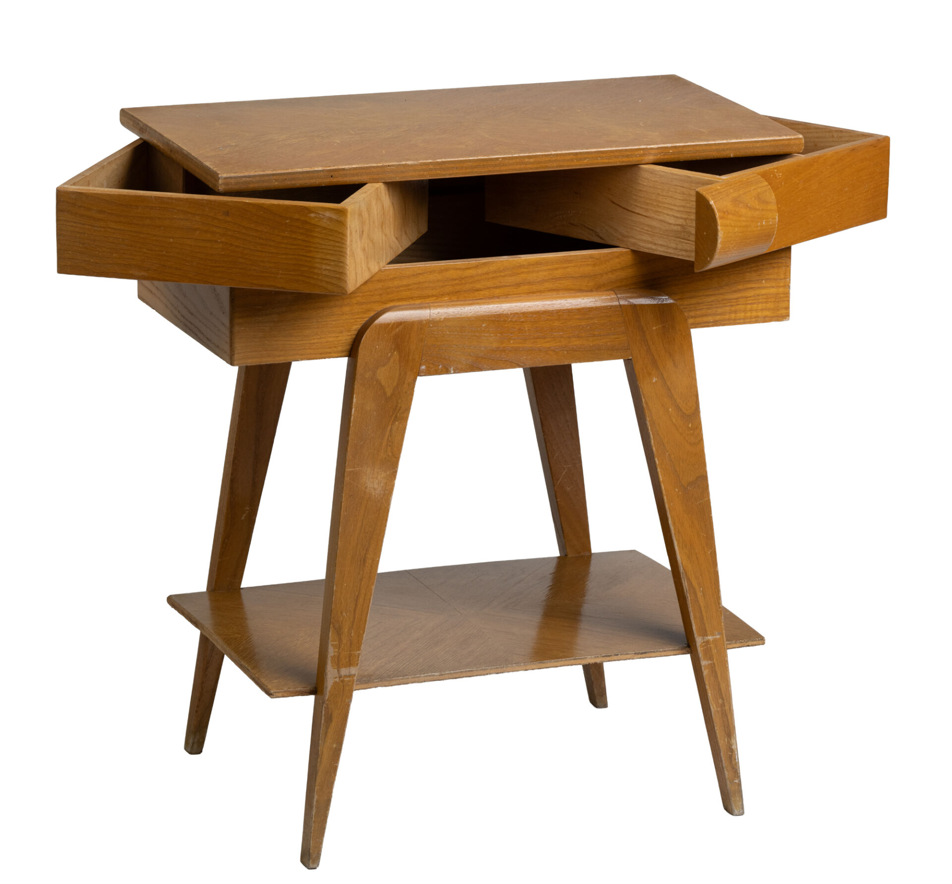 Travailleuse en bois reposant sur quatre pieds compas. Vers 1950. Rayures. H : 56 cm ; L : 49.5 cm ; l :27 cm