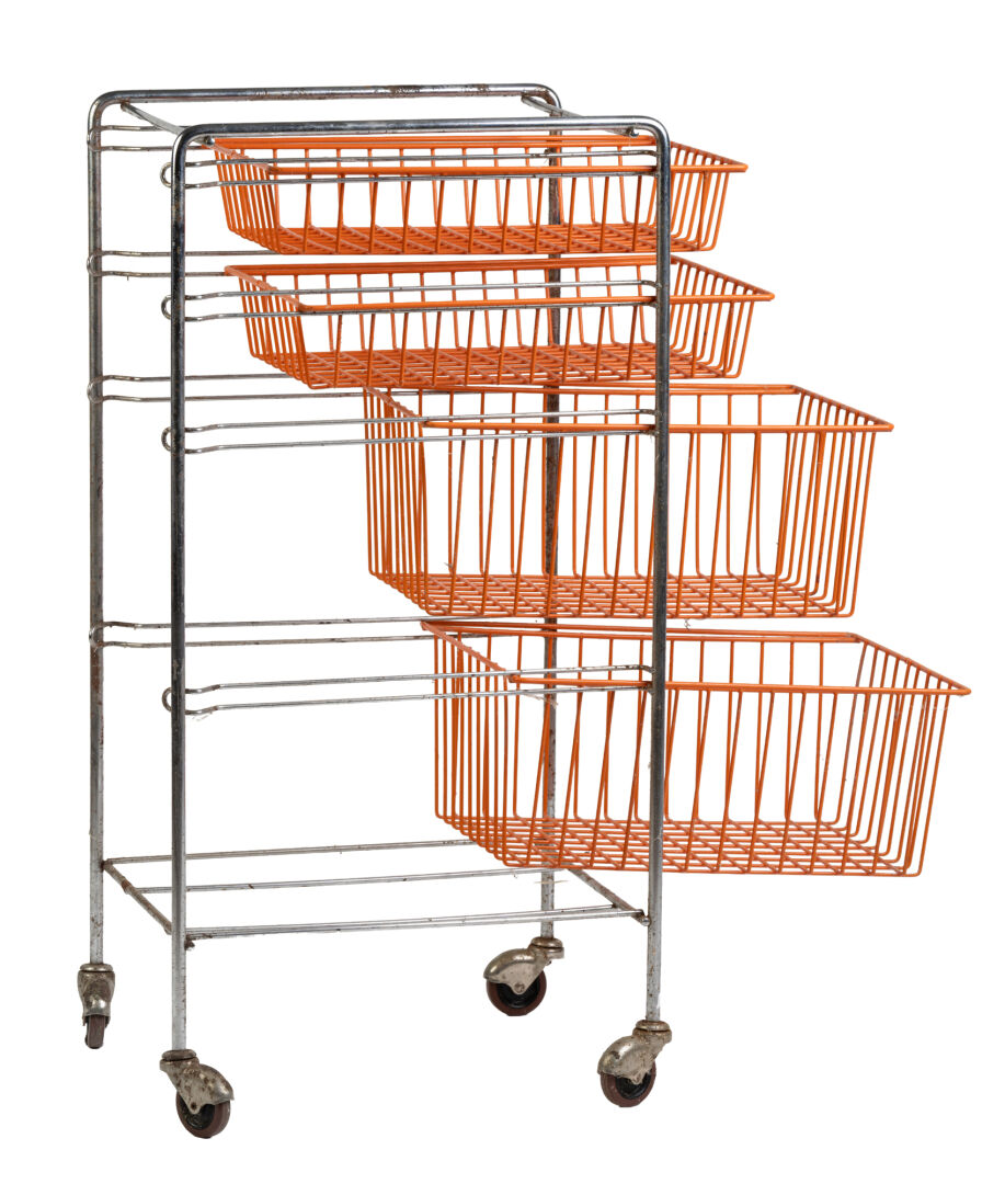 Desserte à roulettes avec paniers en métal orange. Vers 1970. Rouilles. H : 78 cm ; L : 39 cm ; l : 31 cm