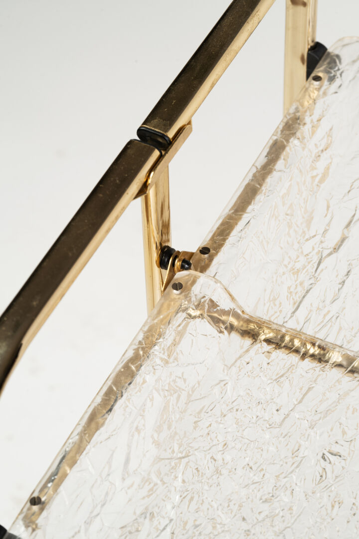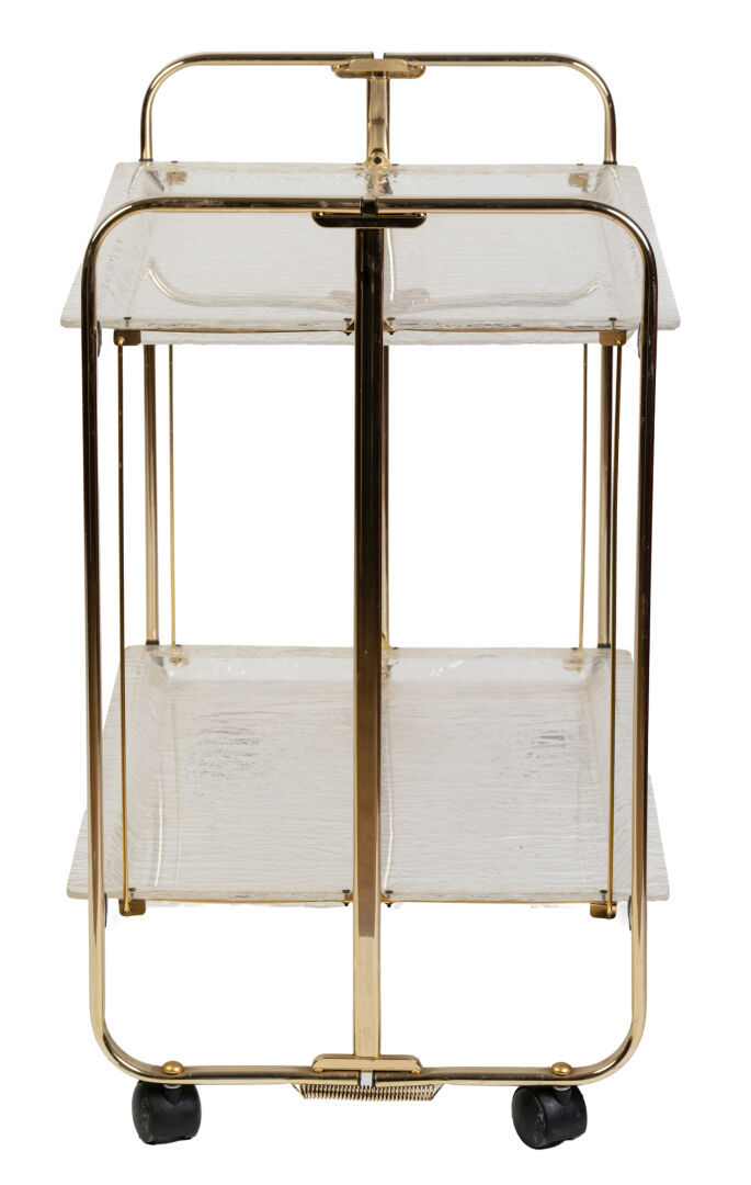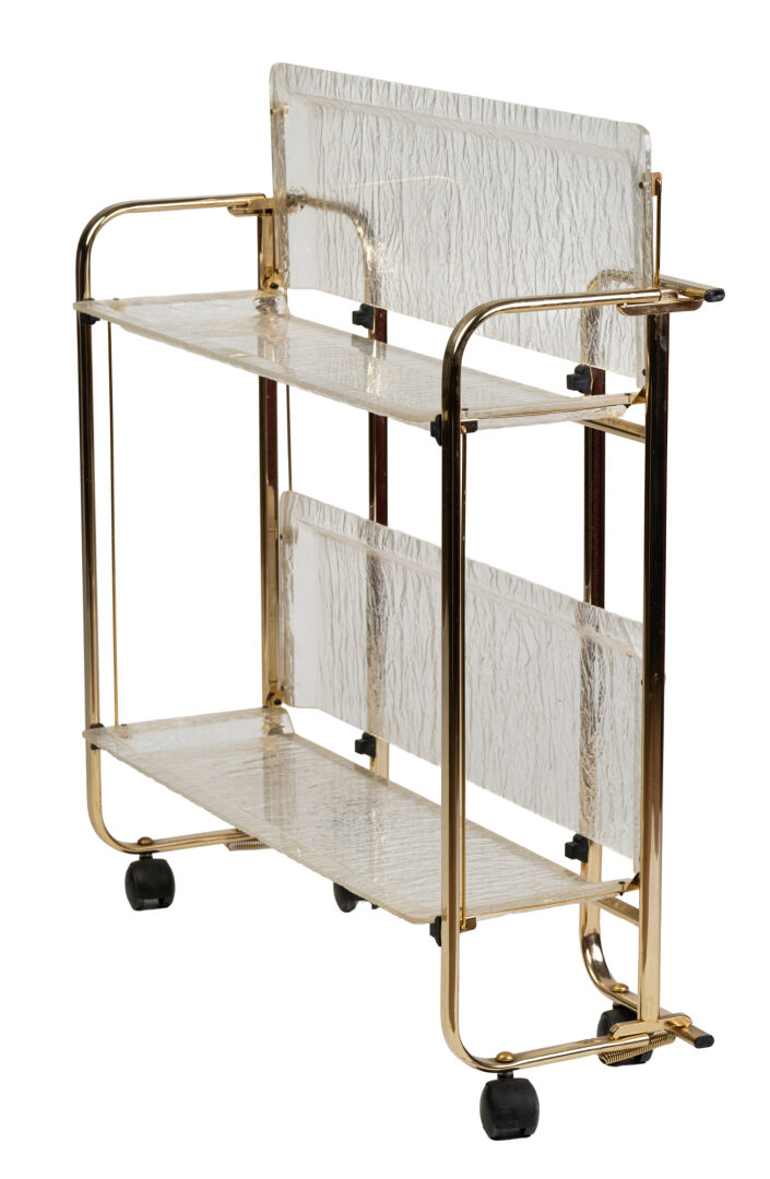 Desserte pliable avec deux plateaux en plastique à motifs "ice" et structure en métal doré sur roulettes. Vers 1970. H : 70 cm ; L : 73 cm ; l : 44 cm