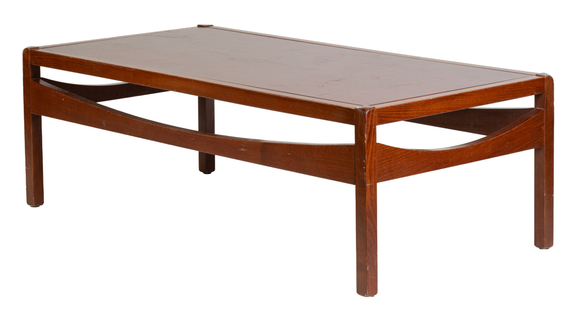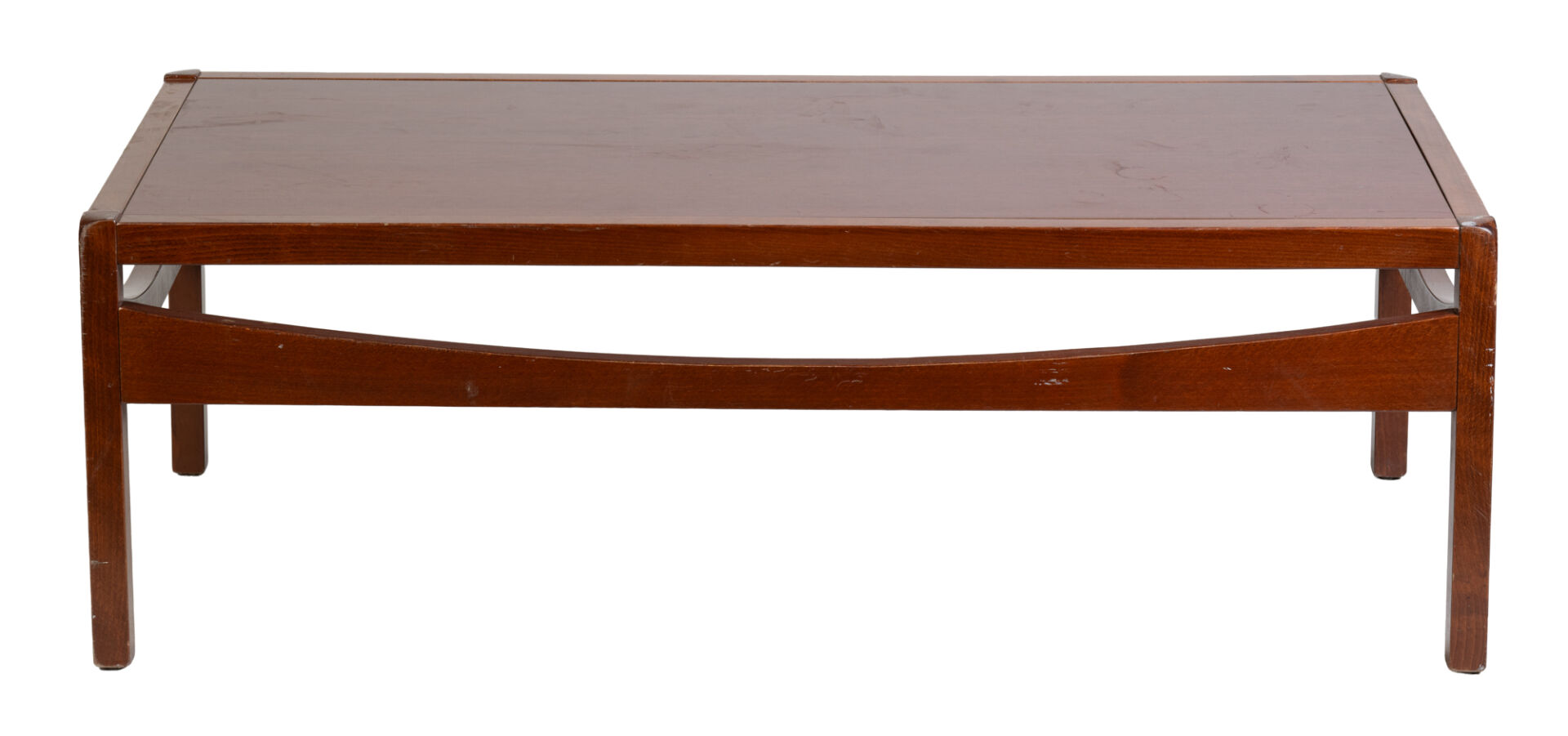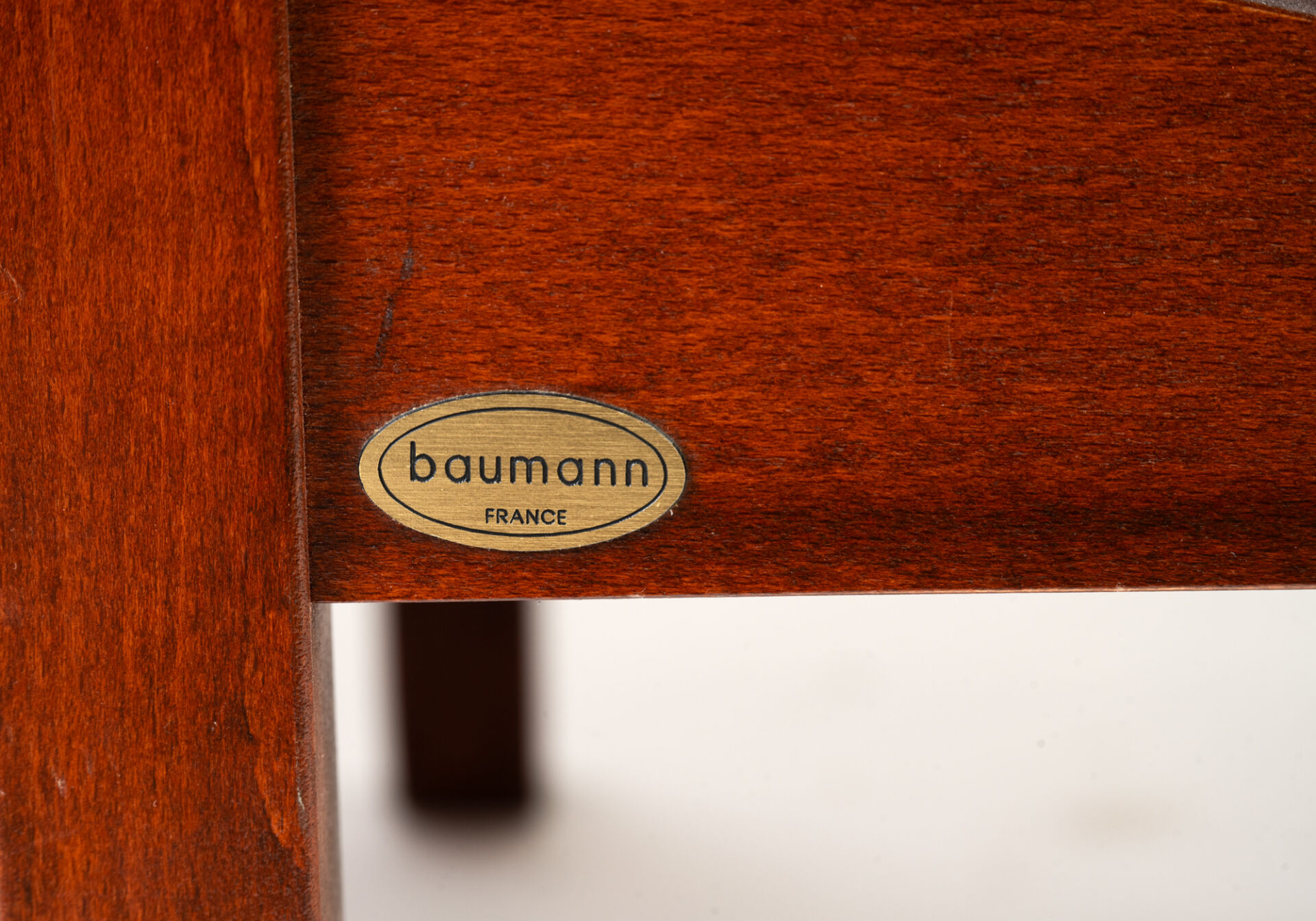 Baumann, France. Salon modèle "Argos" comprenant quatre chaises et une table basse. Portent plaque. Rayures. Table : H : 40 cm ; L : 120 cm ; l : 60 cm Chaise : H : 74 cm ; L : 59 cm ; l : 63 cm