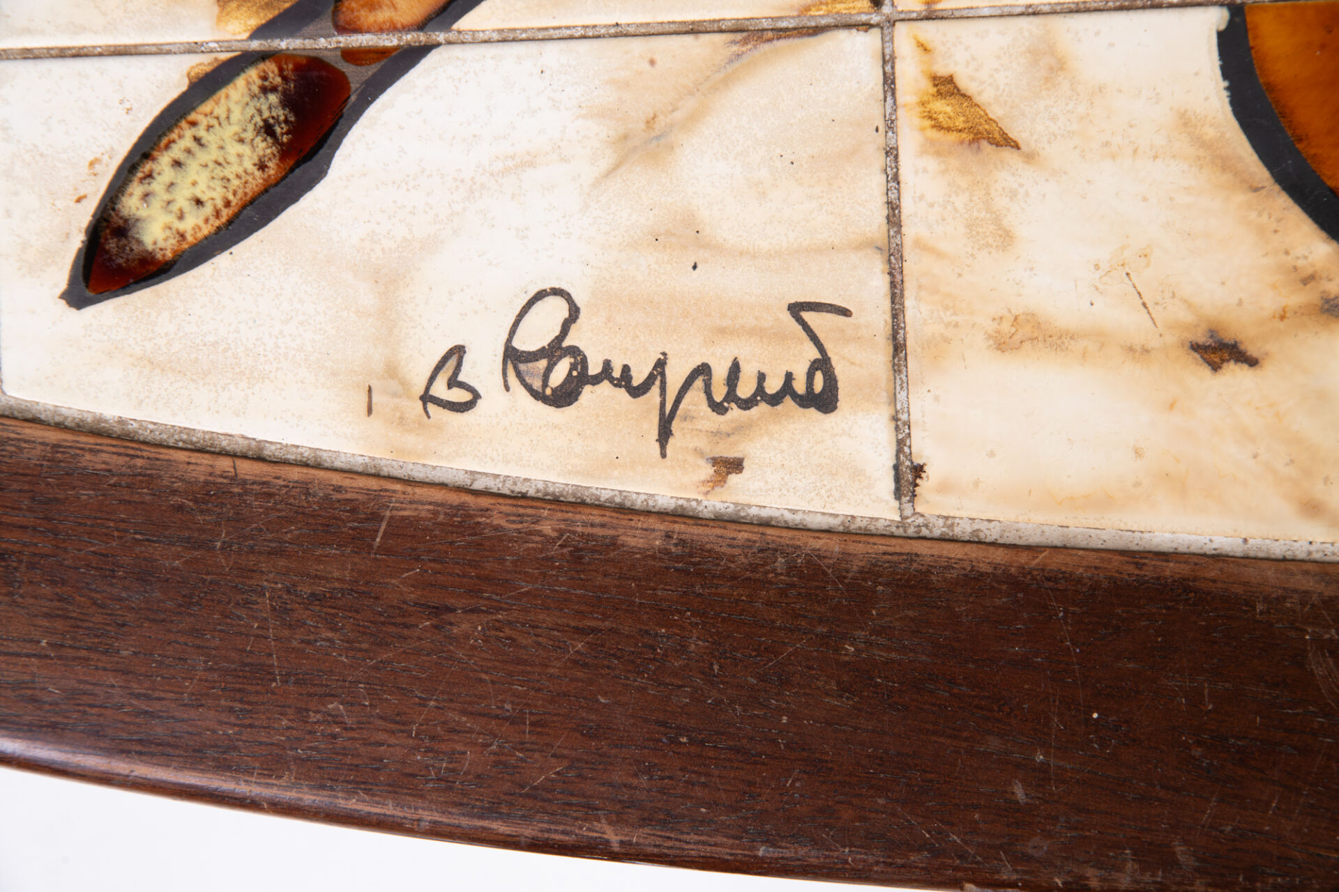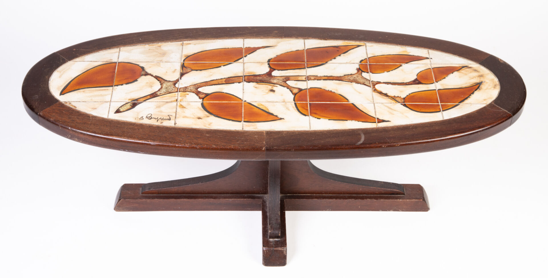 Gustave RAYNAUD (1915-1972). Table basse en bois et dessus en céramique émaillé à décor de feuilles. H : 40,5 cm ; L : 118 cm ; 46,8 cm