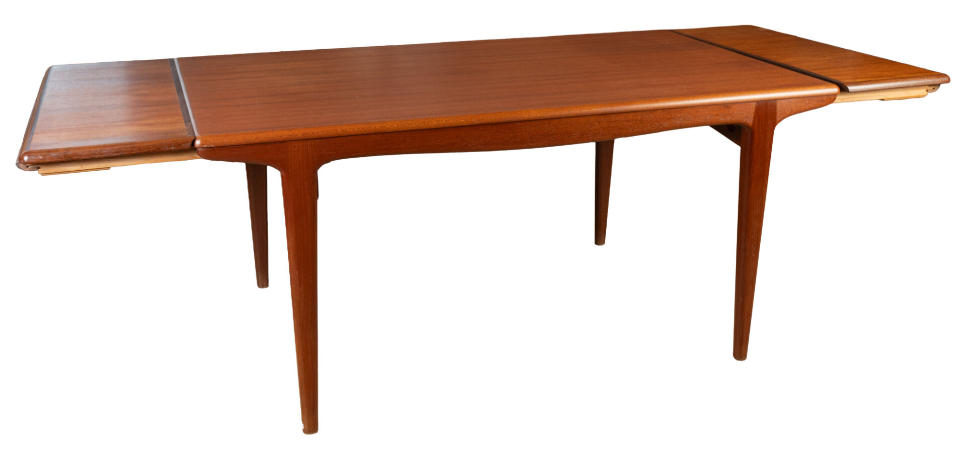 Attribué à Johannes ANDERSEN (1903-1997), Danemark. Table en teck avec deux rallonges. Vers 1960. H : 75 cm ; L : 160cm ; L : 2 40 cm avec rallonge ; l : 88 cm