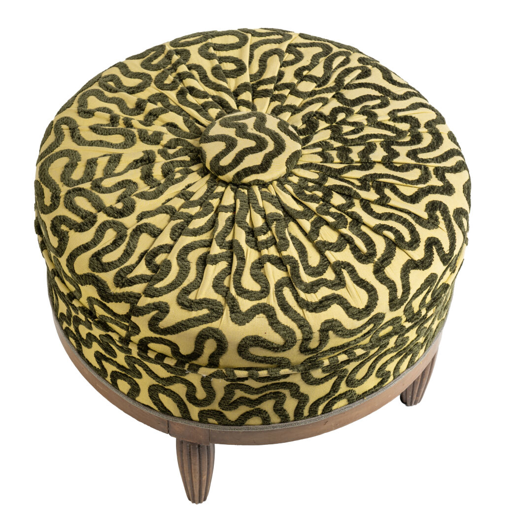 Pouf en tissu et bois. Art Déco. H : 37 cm ; D : 50 cm