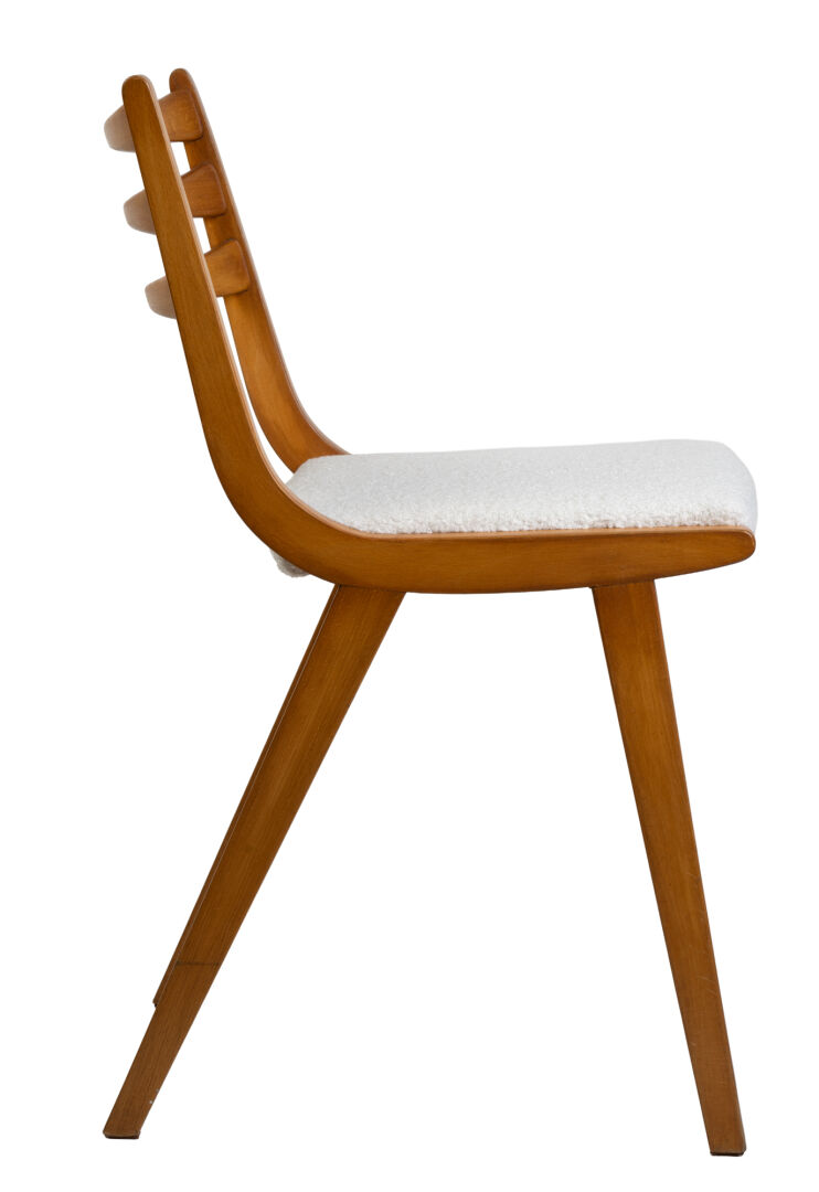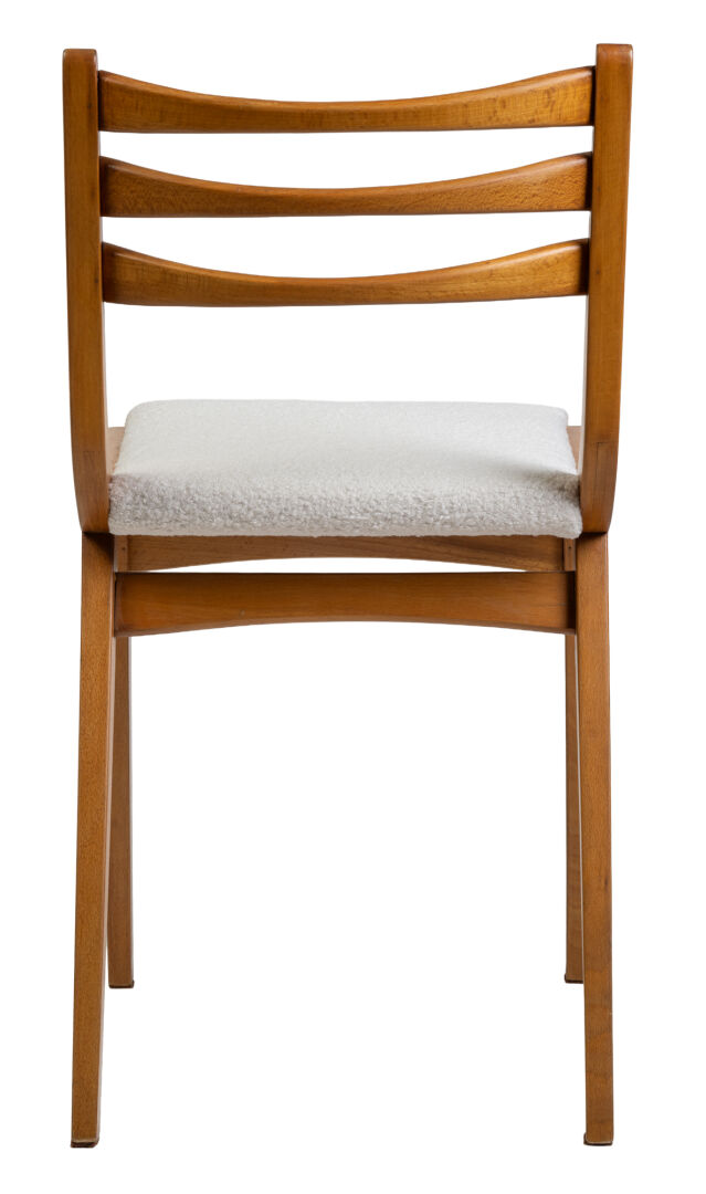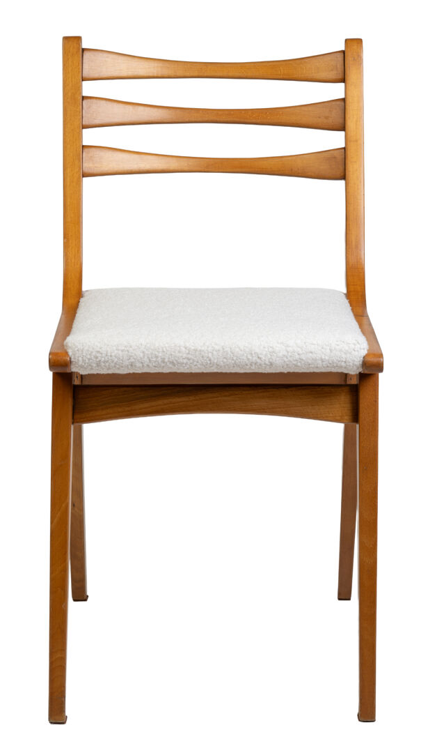 Chaise en bois reposant sur pieds compas, assise en tissu bouclette blanc. Vers 1950-1960. H : 76 cm ; L : 39 cm ; l : 48 cm