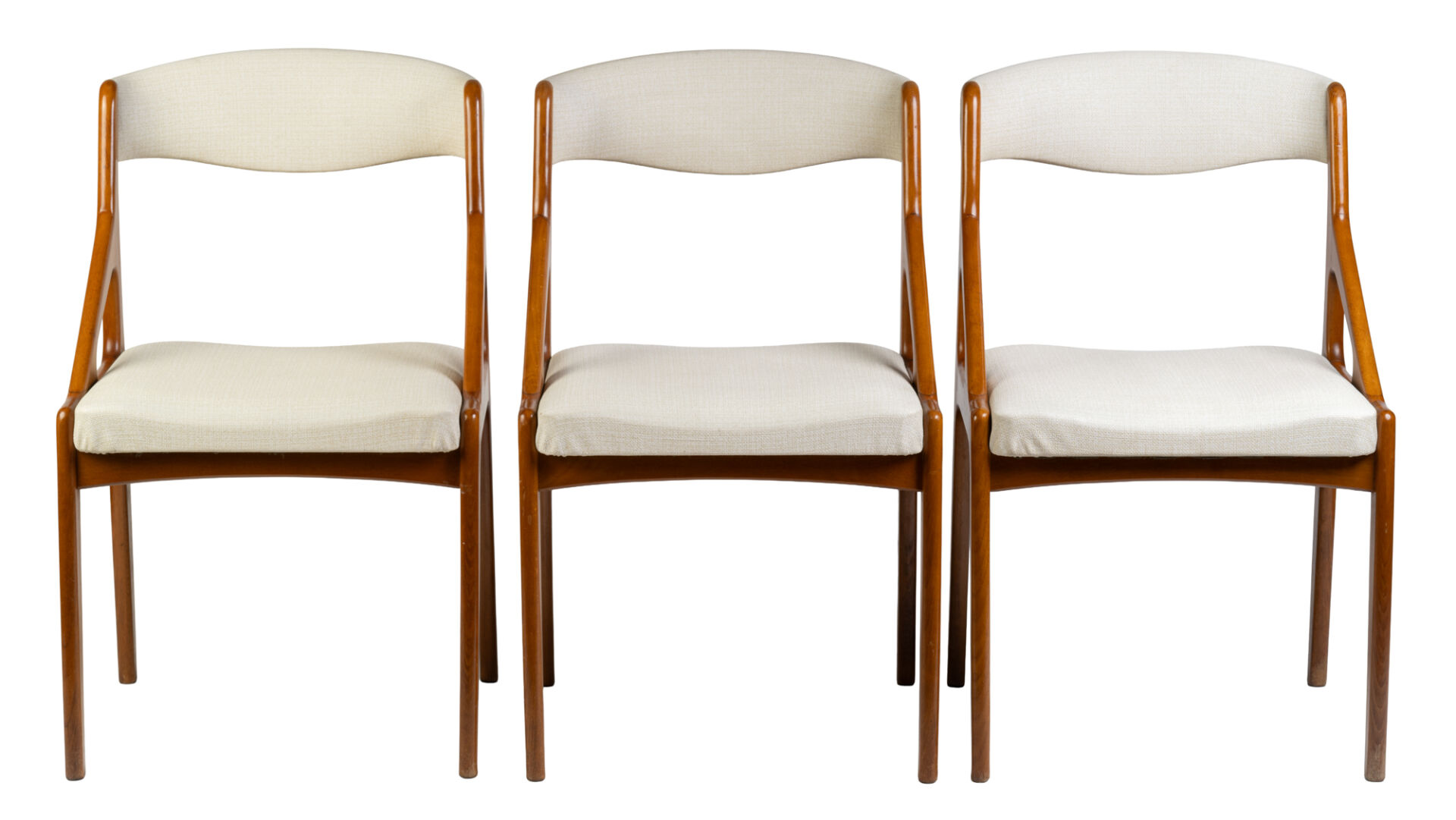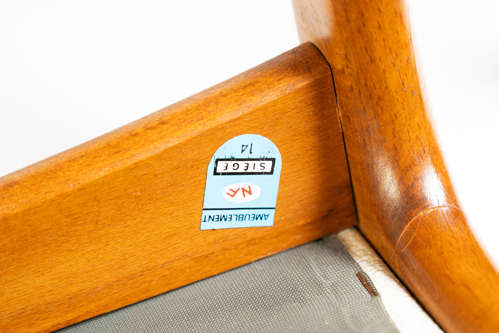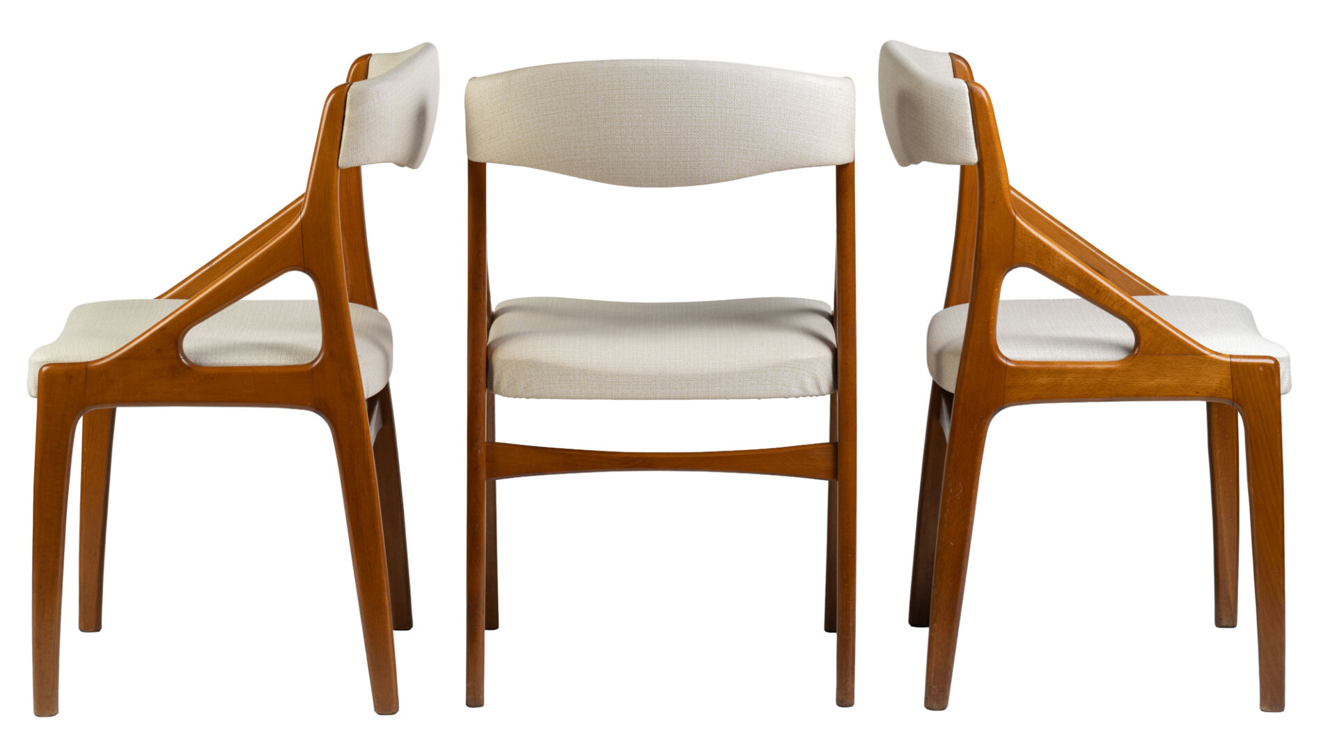 Dans le goût de kai KRISTIANSEN, Scandinavie. Suite de six chaises en bois avec garniture en tissu crème. Vers 1950-1960. H : 83 cm ; L : 49 cm ; l : 50 cm