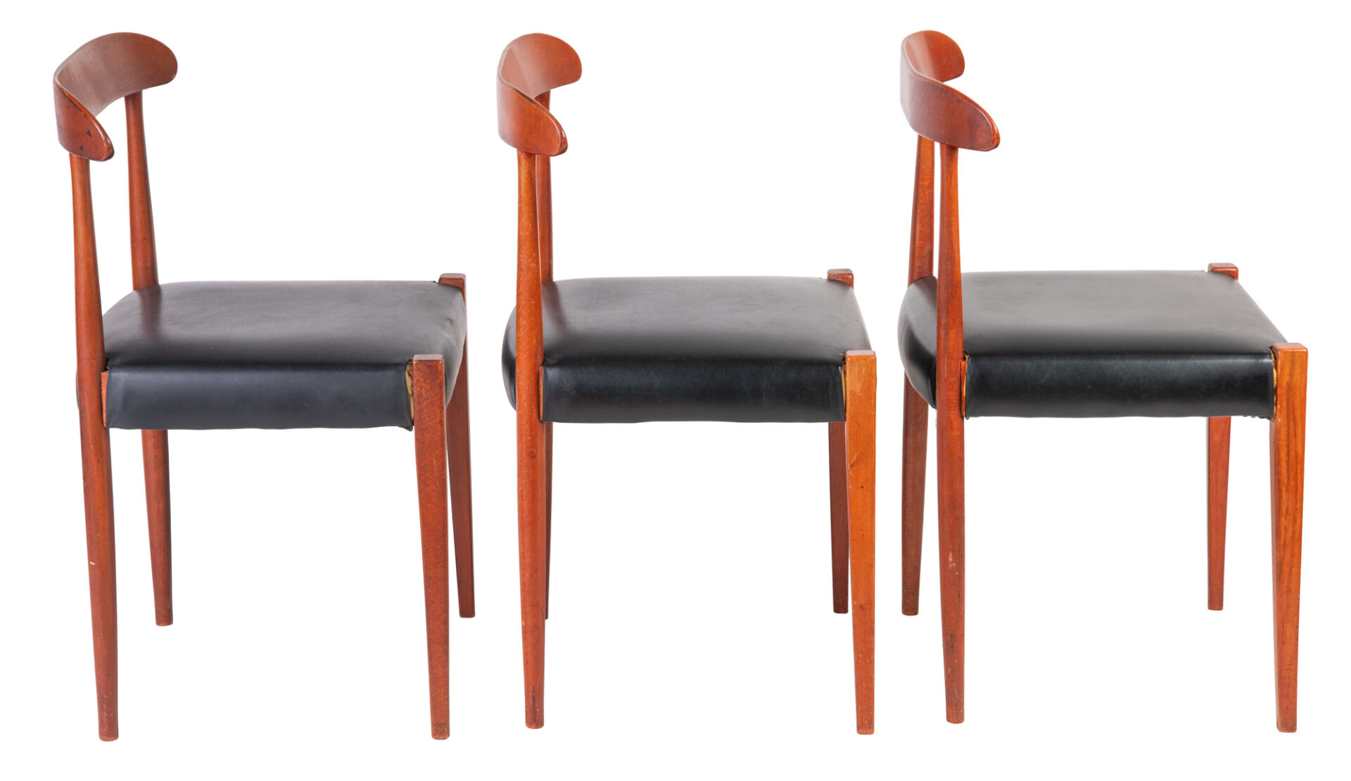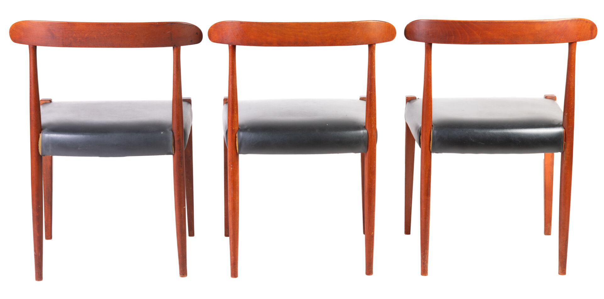 Scandinavie. Suite de trois chaises en bois et similicuir noir. H : 76 cm ; L : 53,5 cm ; l : 42,5 cm