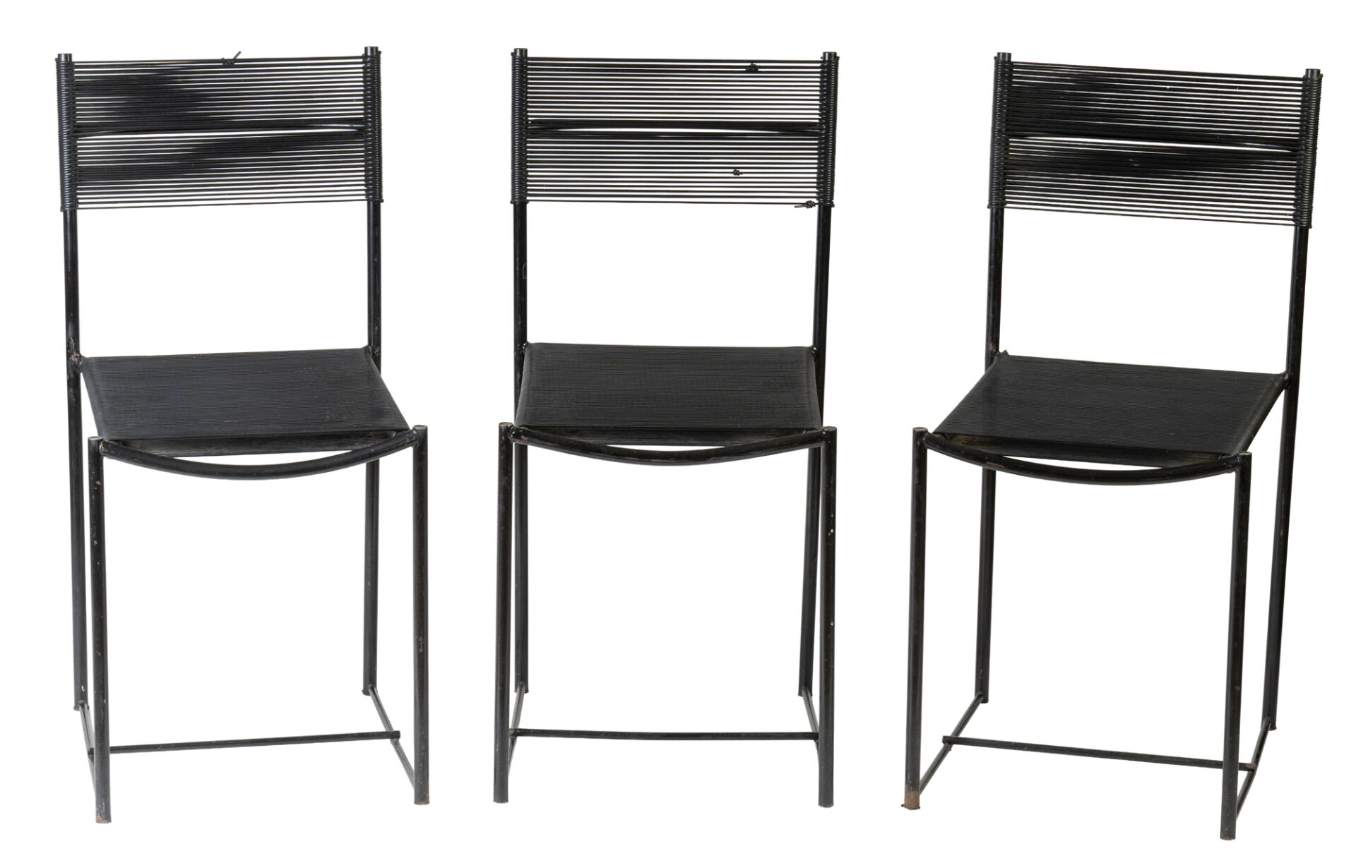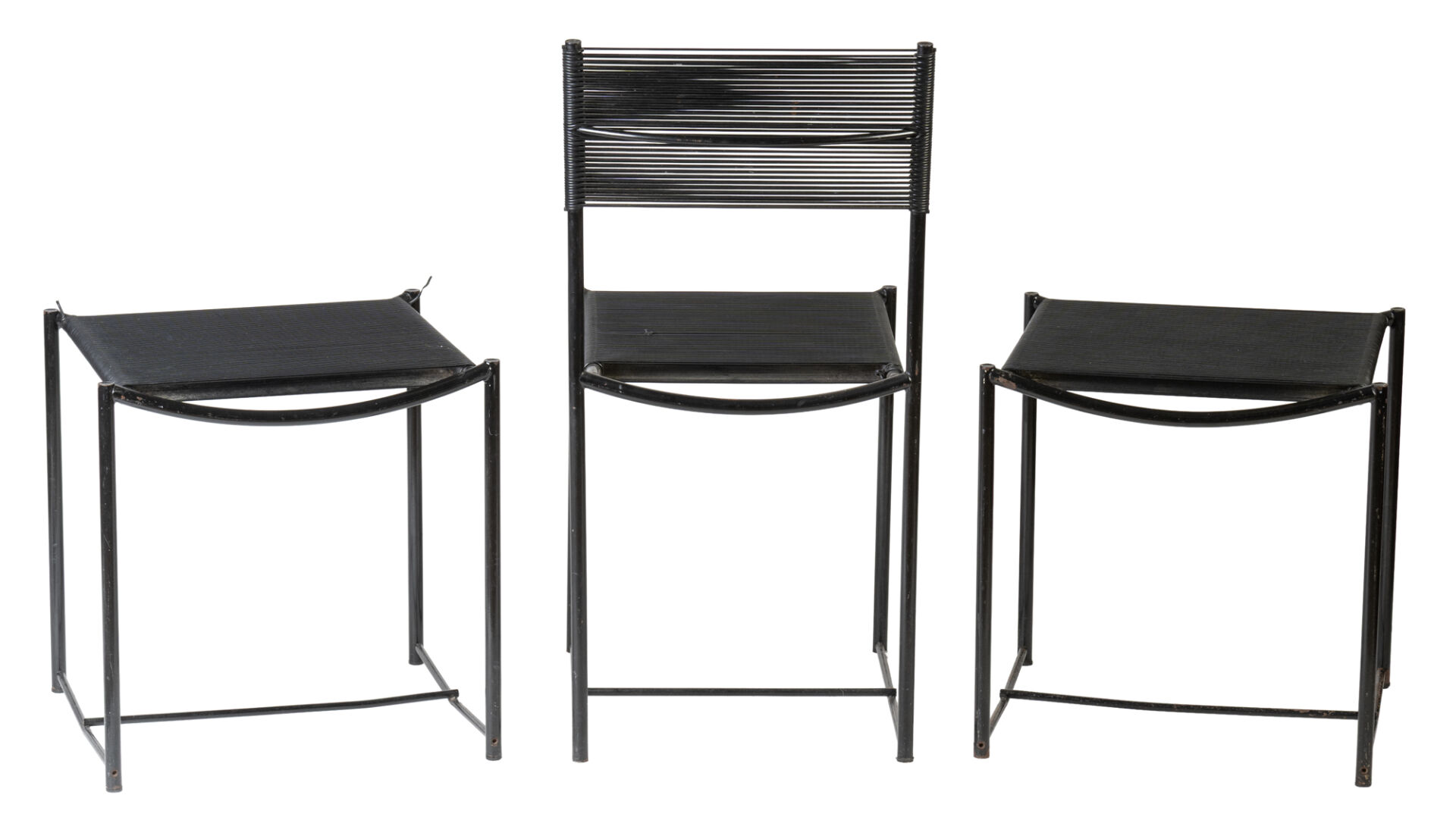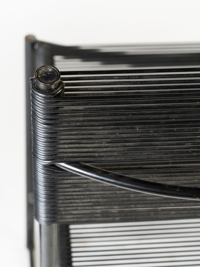 Dans le goût de Giandomenico BELOTTI (1922-2004) pour Édition Alias. Suite de quatre chaises et deux tabourets "Spaghetti" à structure en métal noir et assises en scoubidou. Vers 1980. Rouilles. Chaises : H : 84 cm ; L : 39 cm ; l : 44 cm Tabourets: H : 46 cm ; L : 45 cm ; l : 40 cm