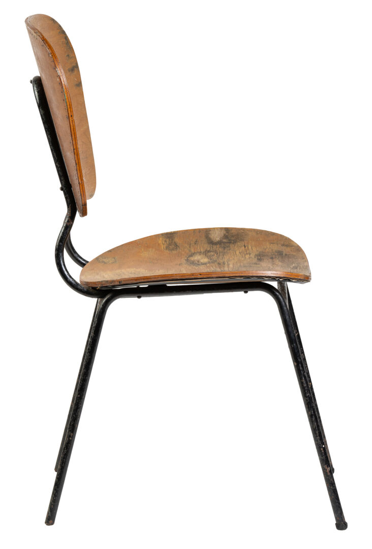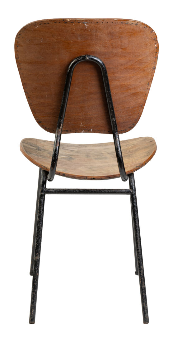 Attribué à Roger LANDAULT (1919-1983), Geneviève DANGLES (née en 1929) et Christian DEFRANCE (né en 1929) pour ABC. Chaise en bois et piètement métallique tubulaire noir. H : 83 cm ; L : 38.5 cm ; l : 42 cm