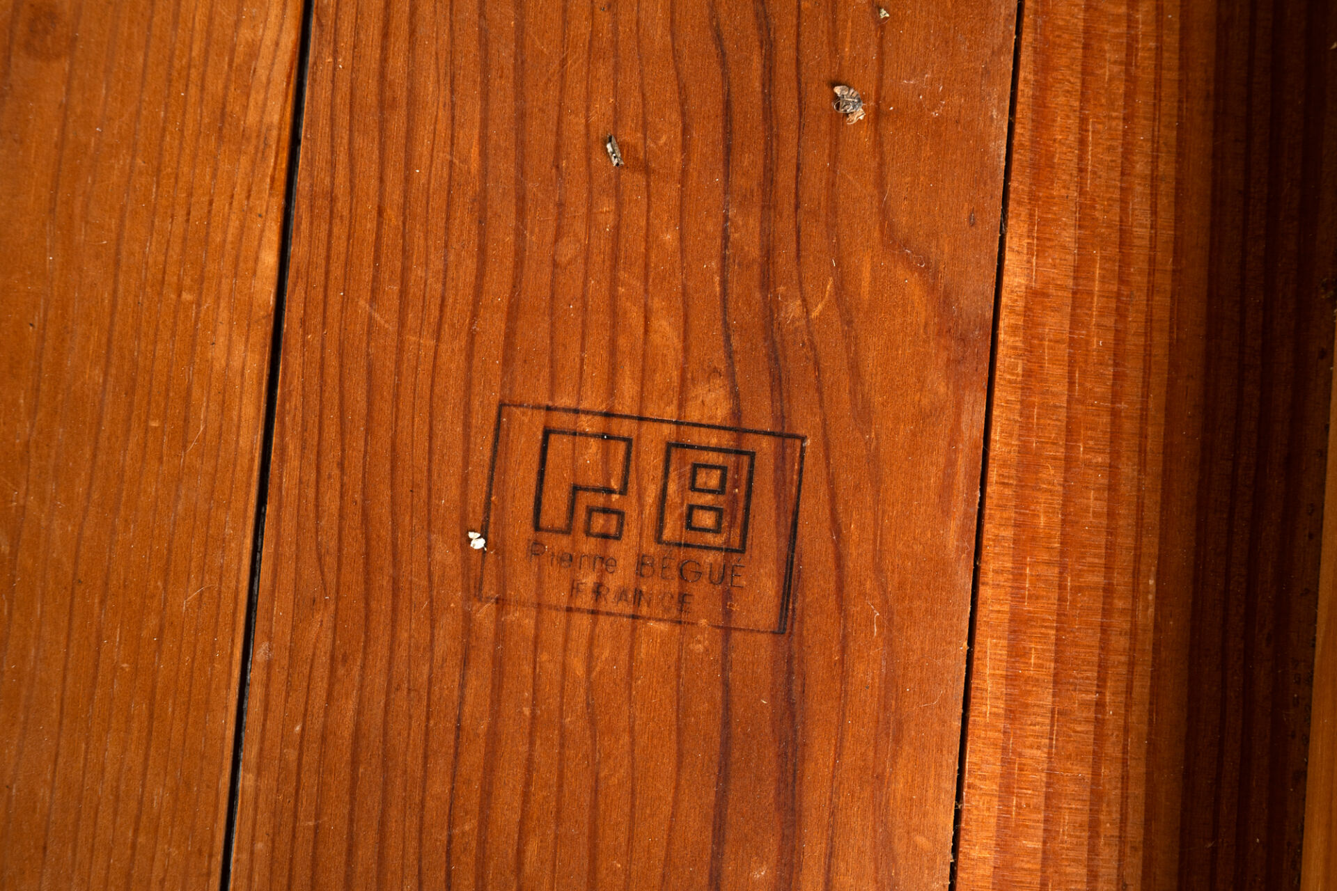 Pierre BEGUE, France. Suite de quatre chaises en bois. Vers 1960. Portent le tampon sous l'assise. H : 81 cm ; L : 39 cm l : 45 cm