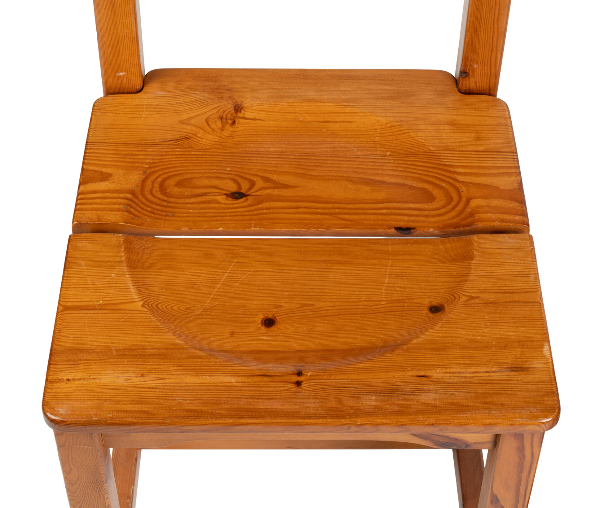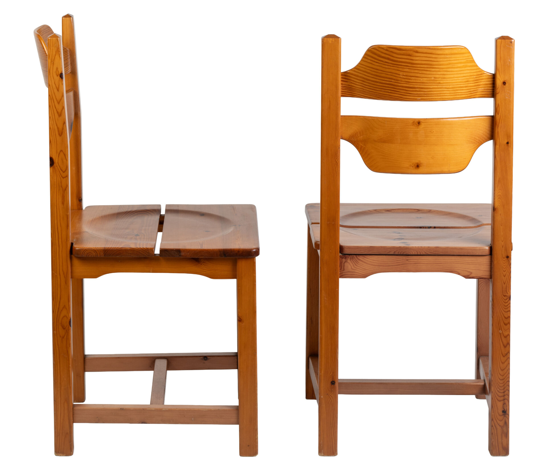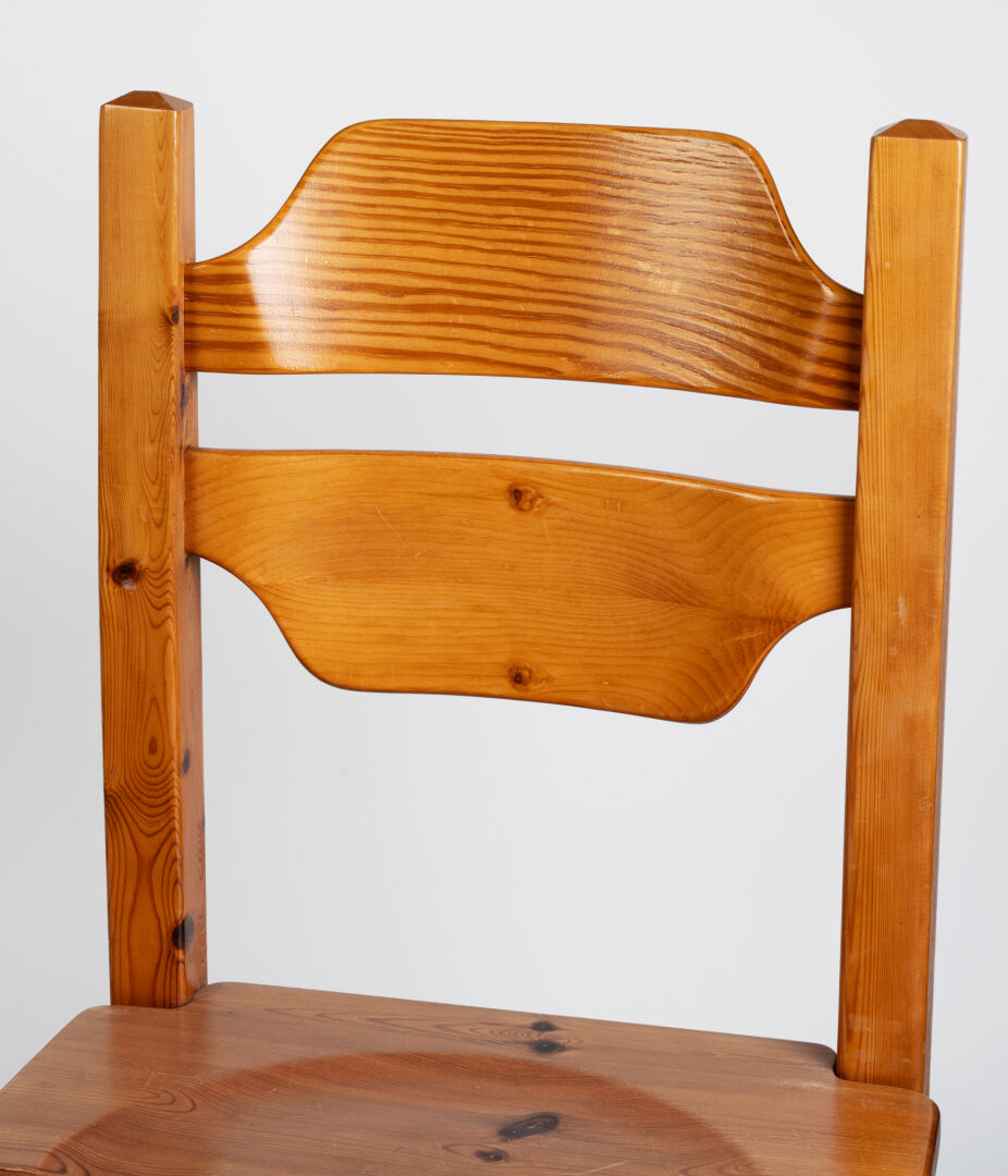 Dans le goût de la Maison Regain. Paire de chaises en pin. H : 89 cm ; L : 44 cm ; l : 44 cm