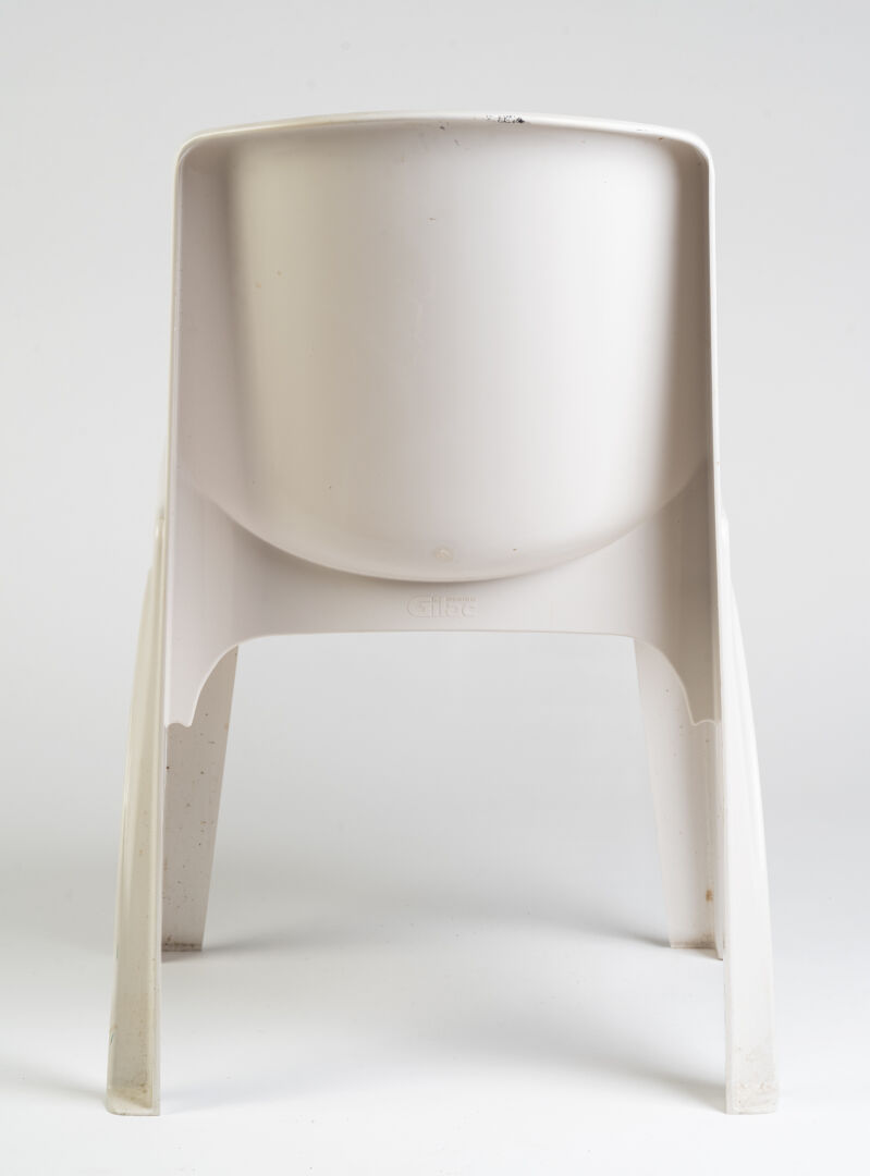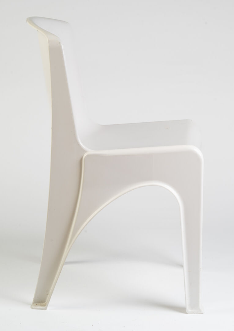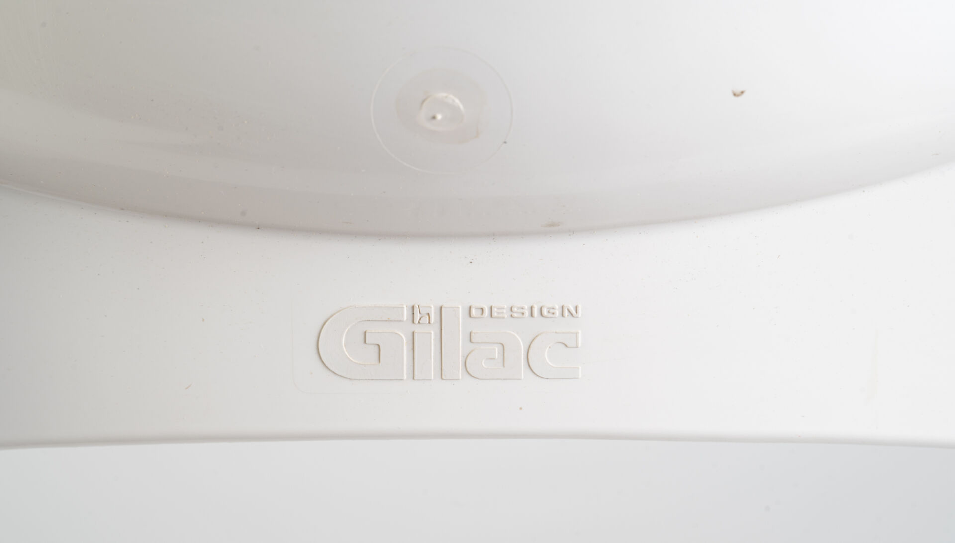 Helmut BLATZNE pour Gilac Design. Chaise en plastique blanc. Marquée. Légères rayures. H : 75 cm ; L : 43 cm ; l : 43 cm