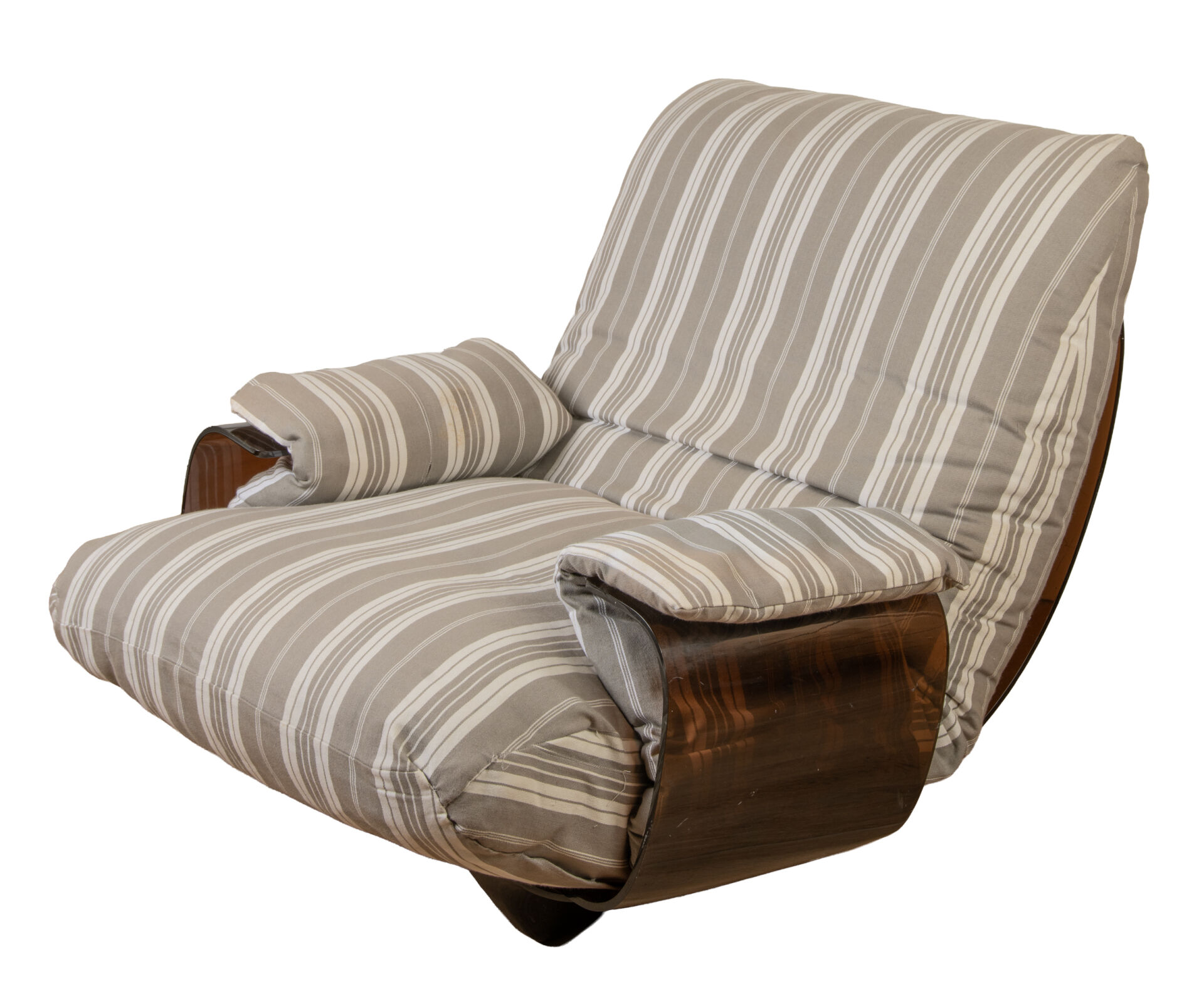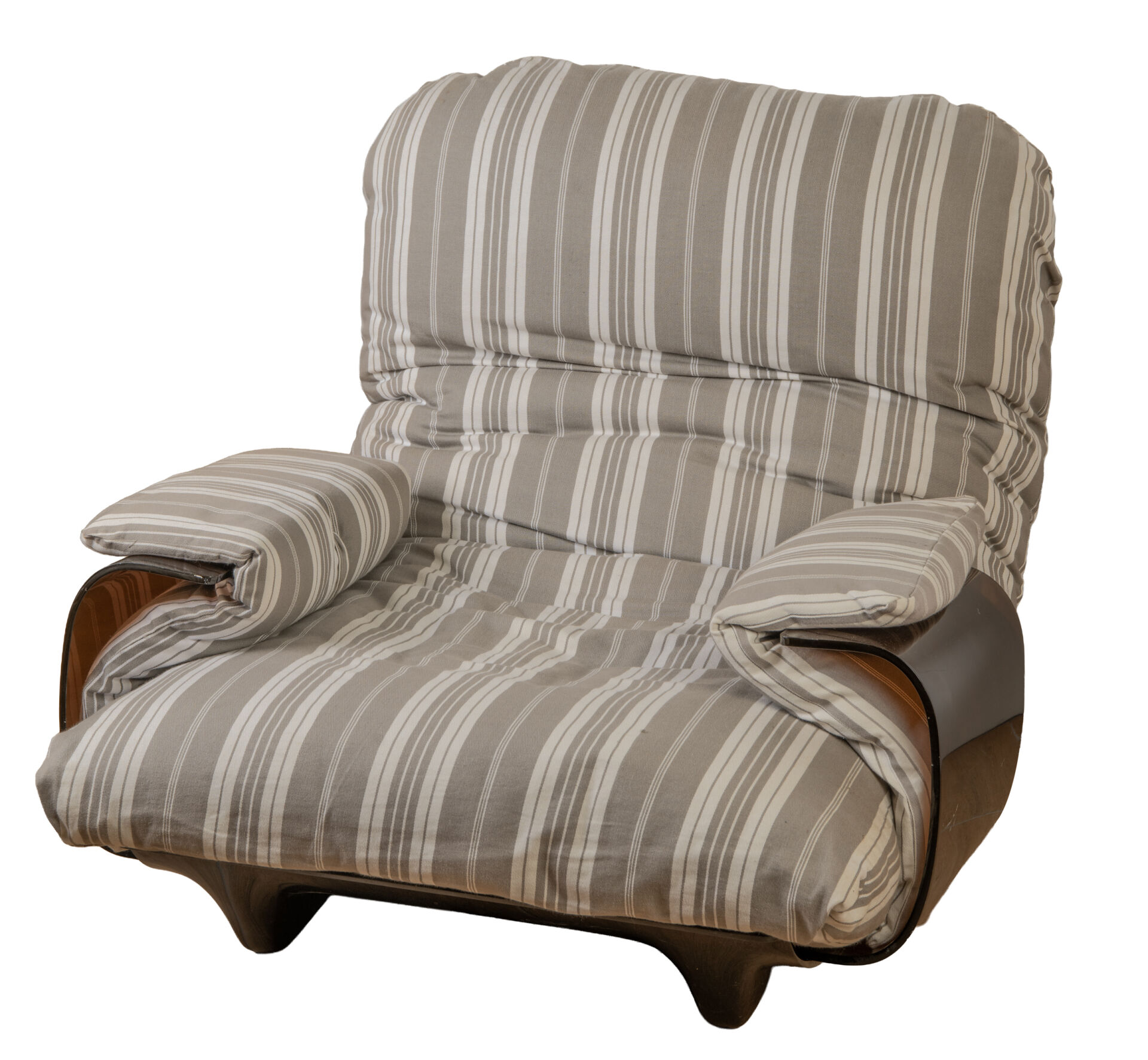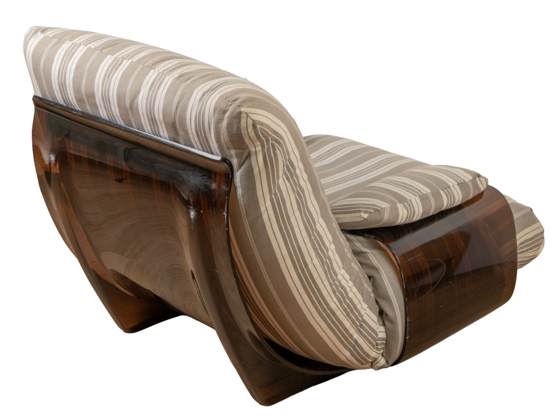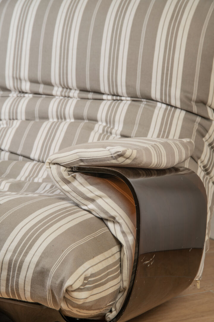 Michel DUCAROY (1925-2009) pour Ligne Roset . Salon modèle "Marsala" comprenant un canapé trois places et une paire de fauteuils avec une coque en altuglas thermoformé fumé et une garniture en tissu rayé. Vers 1970. Canapé : H : 30 cm (assise) ; L : 210 cm ; P : 100 cm. Fauteuils : H : 35 cm ; L : 86 cm ; P : 100 cm.