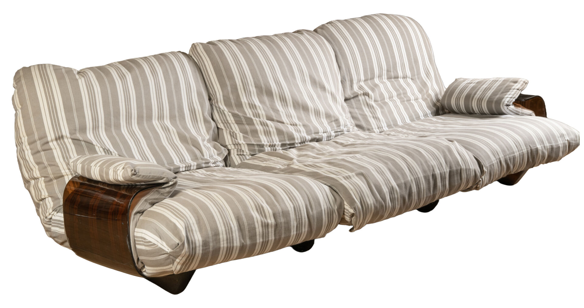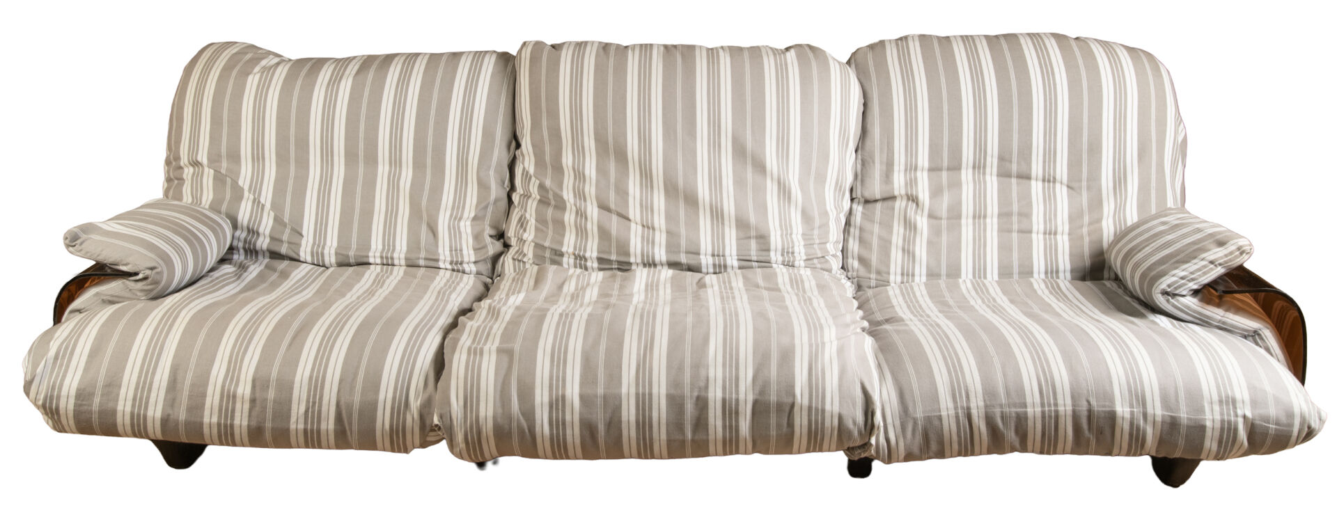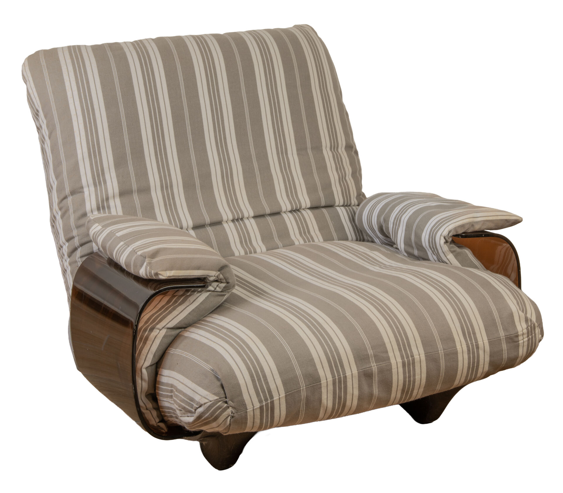 Michel DUCAROY (1925-2009) pour Ligne Roset . Salon modèle "Marsala" comprenant un canapé trois places et une paire de fauteuils avec une coque en altuglas thermoformé fumé et une garniture en tissu rayé. Vers 1970. Canapé : H : 30 cm (assise) ; L : 210 cm ; P : 100 cm. Fauteuils : H : 35 cm ; L : 86 cm ; P : 100 cm.