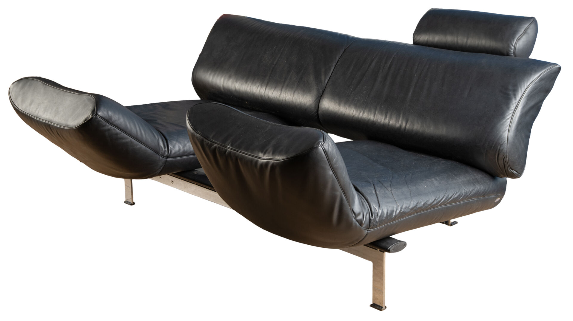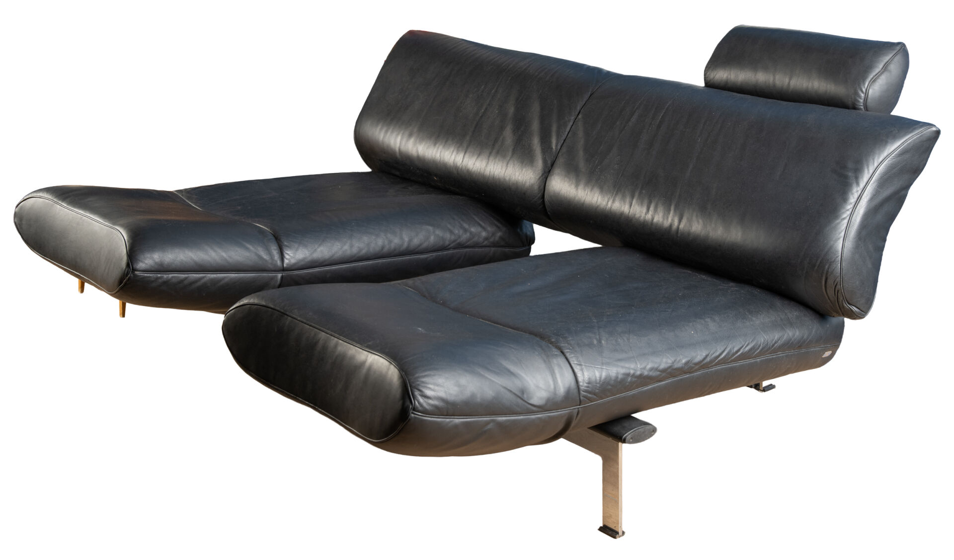 Reto FRIGG pour De Sede. Canapé modèle "DS-140" en cuir noir. H : 78 cm ; L : 233 cm ; l : 93 cm. H : 90 cm (avec le repose tête).