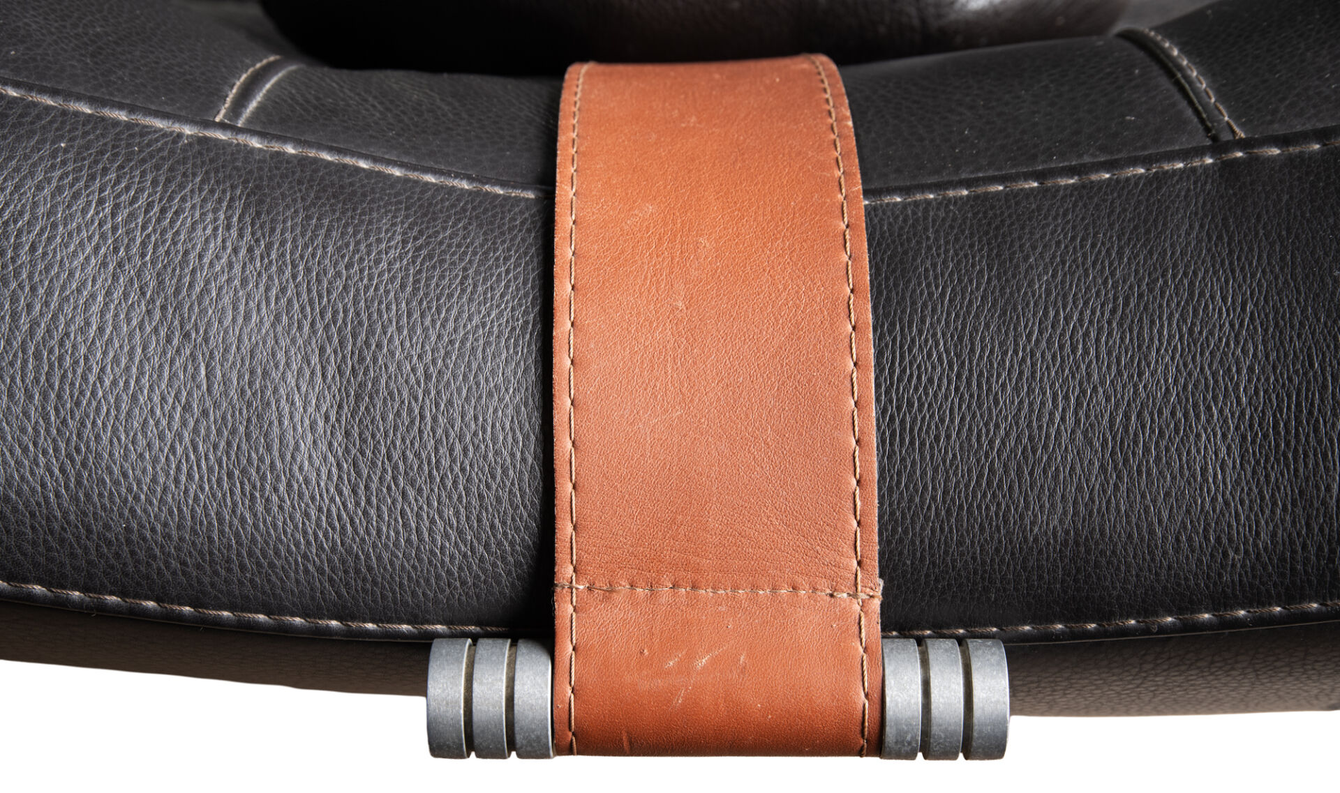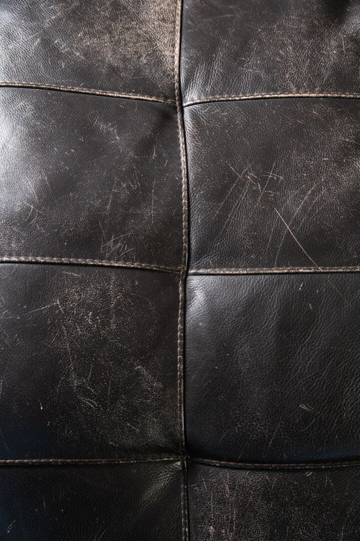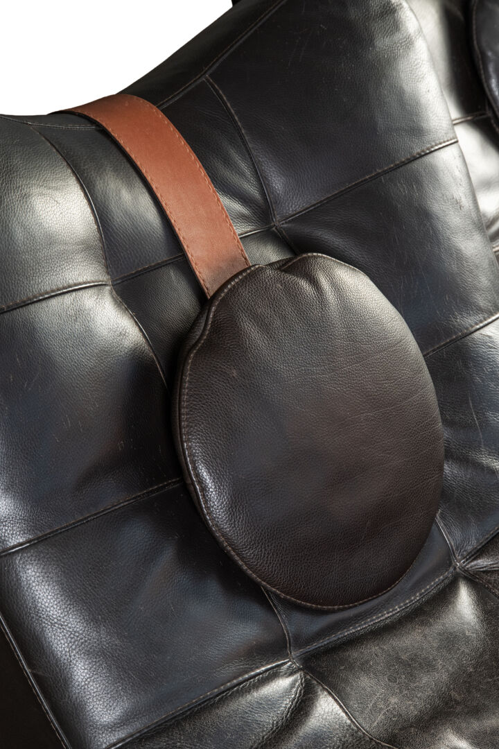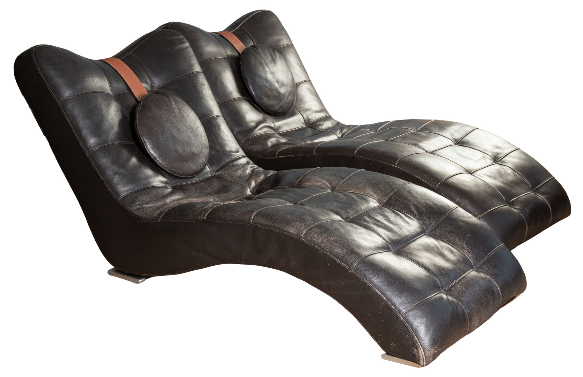 Italie. Paire de chauffeuses longues en cuir avec appuie-tête. Rayures sur le cuir. H : 84 cm ; L : 170 cm : l : 77 cm