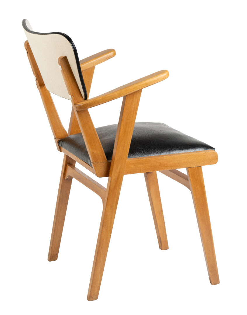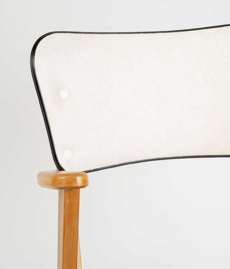 Dans le goût de Roger LANDAULT (1919-1983) Fauteuil dit "bridge" en bois et, garniture en simili cuir noir et blanc. Vers 1960. H : 81 cm ; L : 51 cm ; l : 52 cm