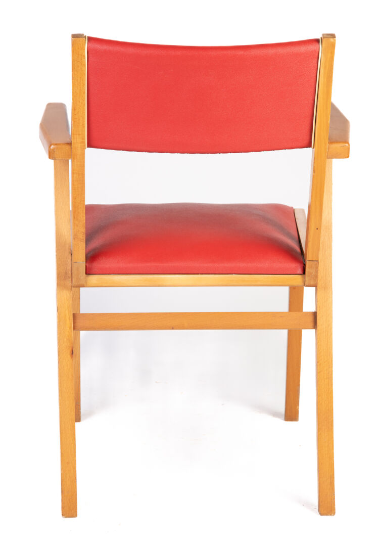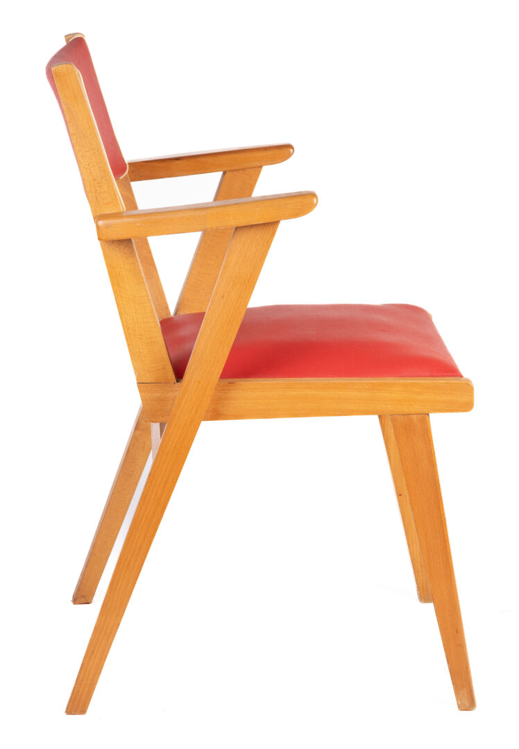 Fauteuil dit "bridge" reposant sur quatre pieds compas, garniture en simili cuir rouge. Vers 1950. H : 81 cm ; L ; 54 cm ; l : 52 cm
