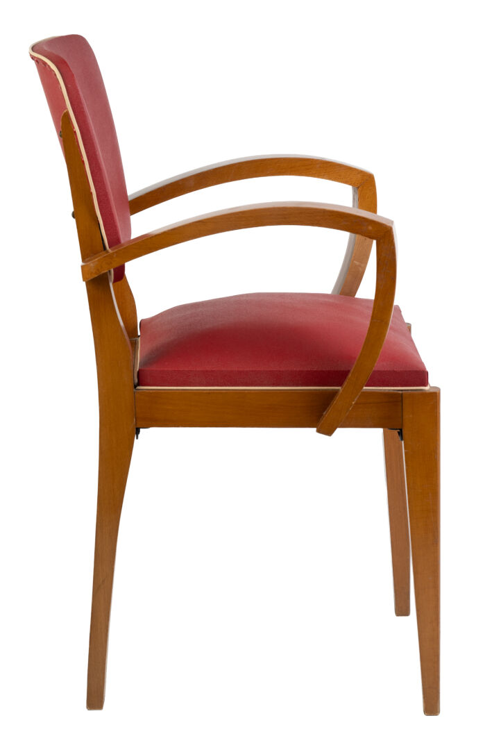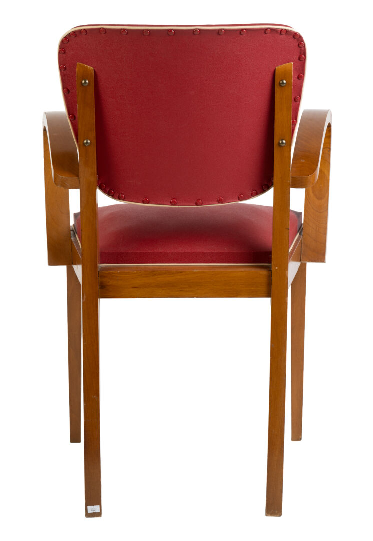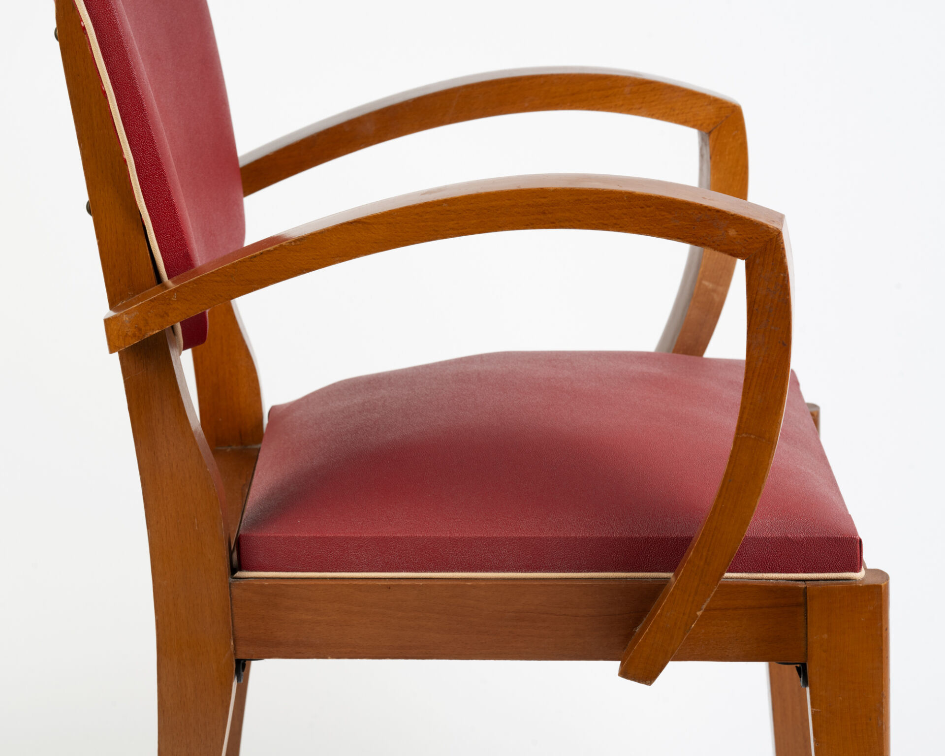 Fauteuil dit "bridge" dans le goût Art Déco en bois et garniture en simili cuir rouge. H : 85 cm ; L : 53 cm ; l : 50 cm