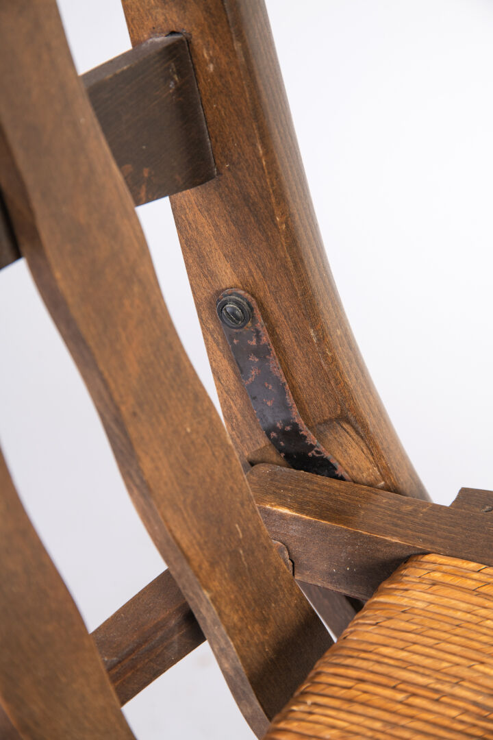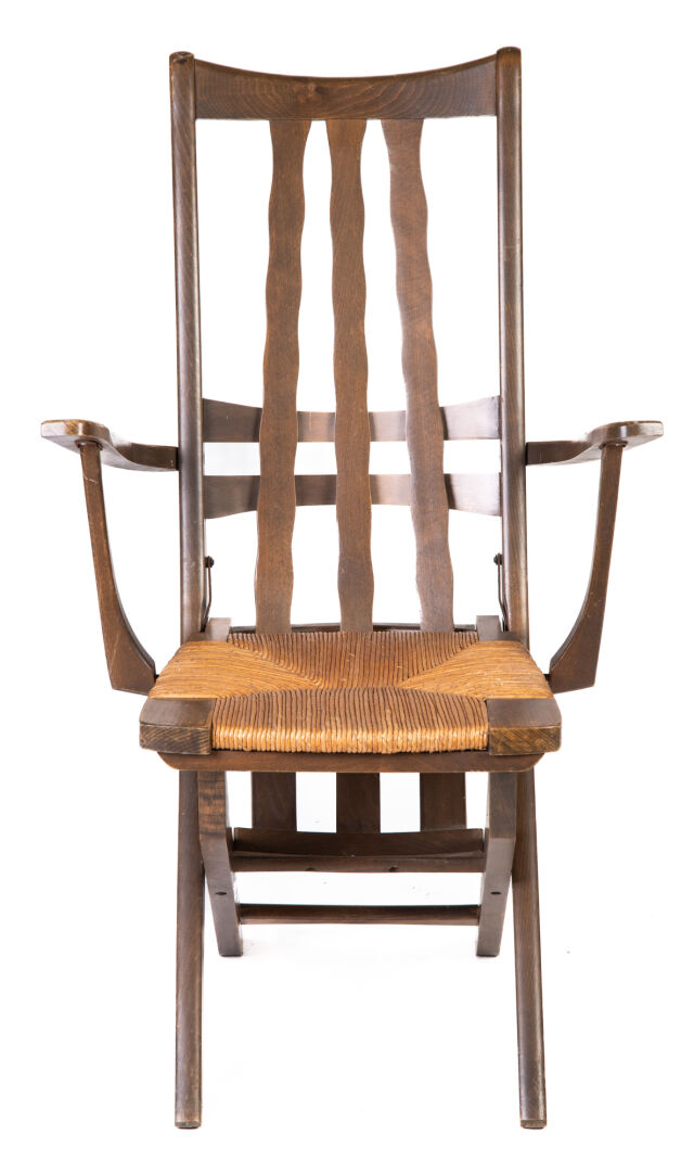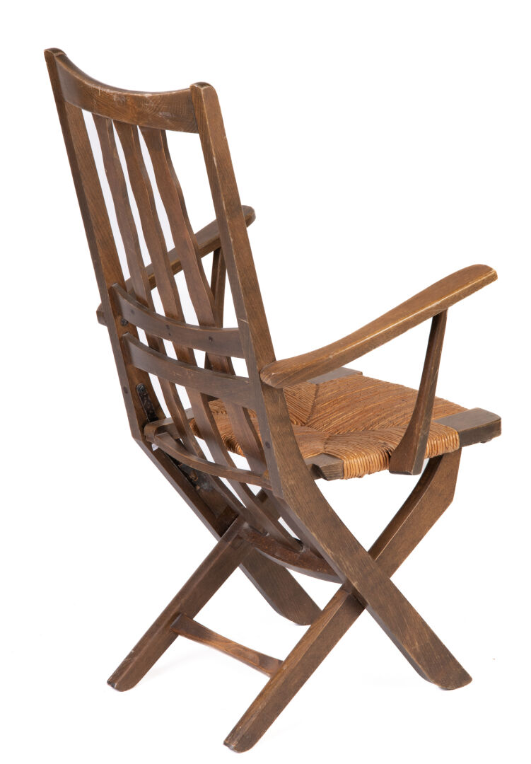 Dans le goût brutaliste. Fauteuil en bois à crémaillère pliant, assise paillée. Vers 1950. H : 102 cm ; L : 61 cm ; l : 53 cm