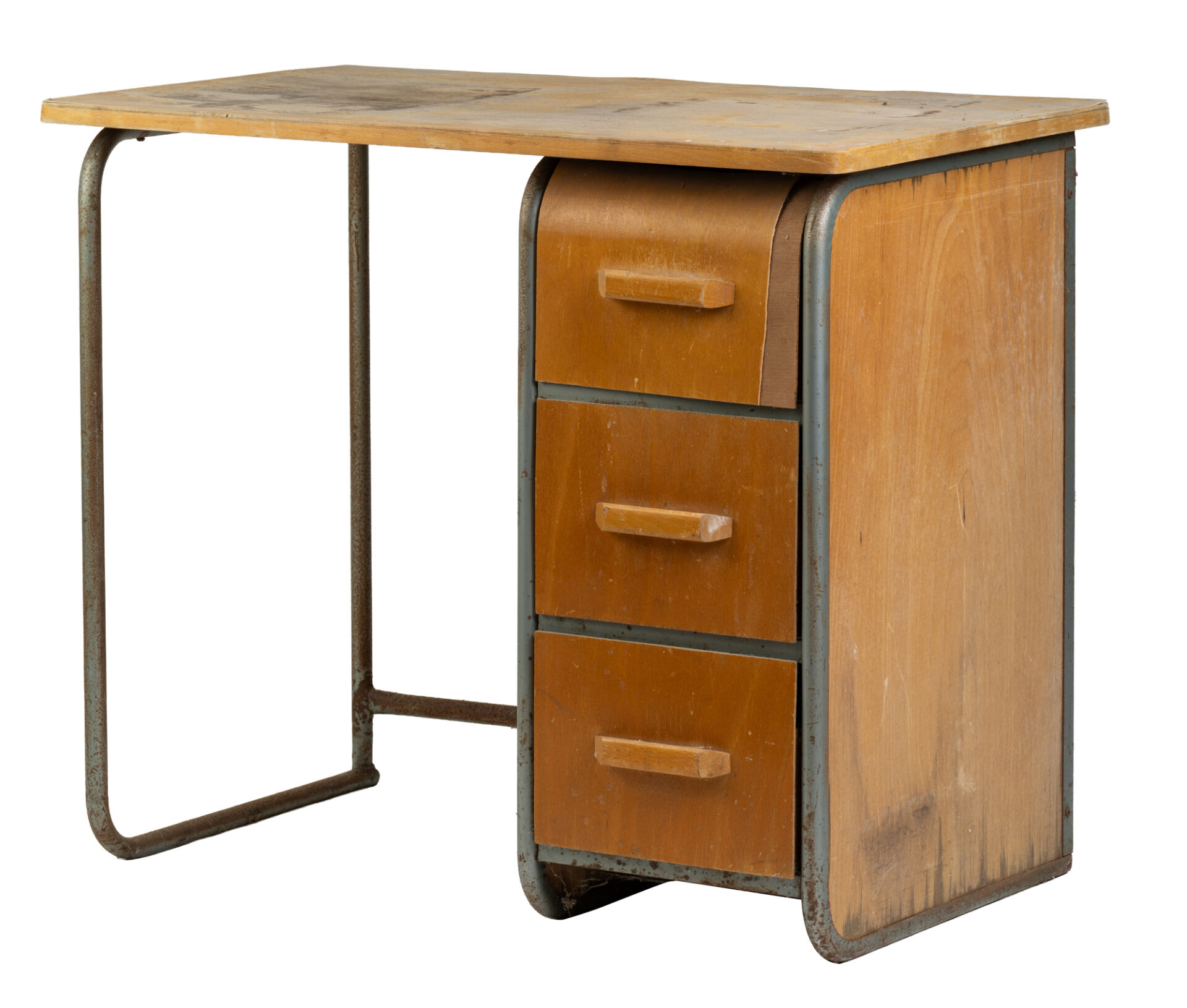Bureau d'écolier en bois et structure en métal tubulaire. Vers 1960. Accidents au placage. H : 68,5 cm ; L : 79,5 cm ; l : 50 cm