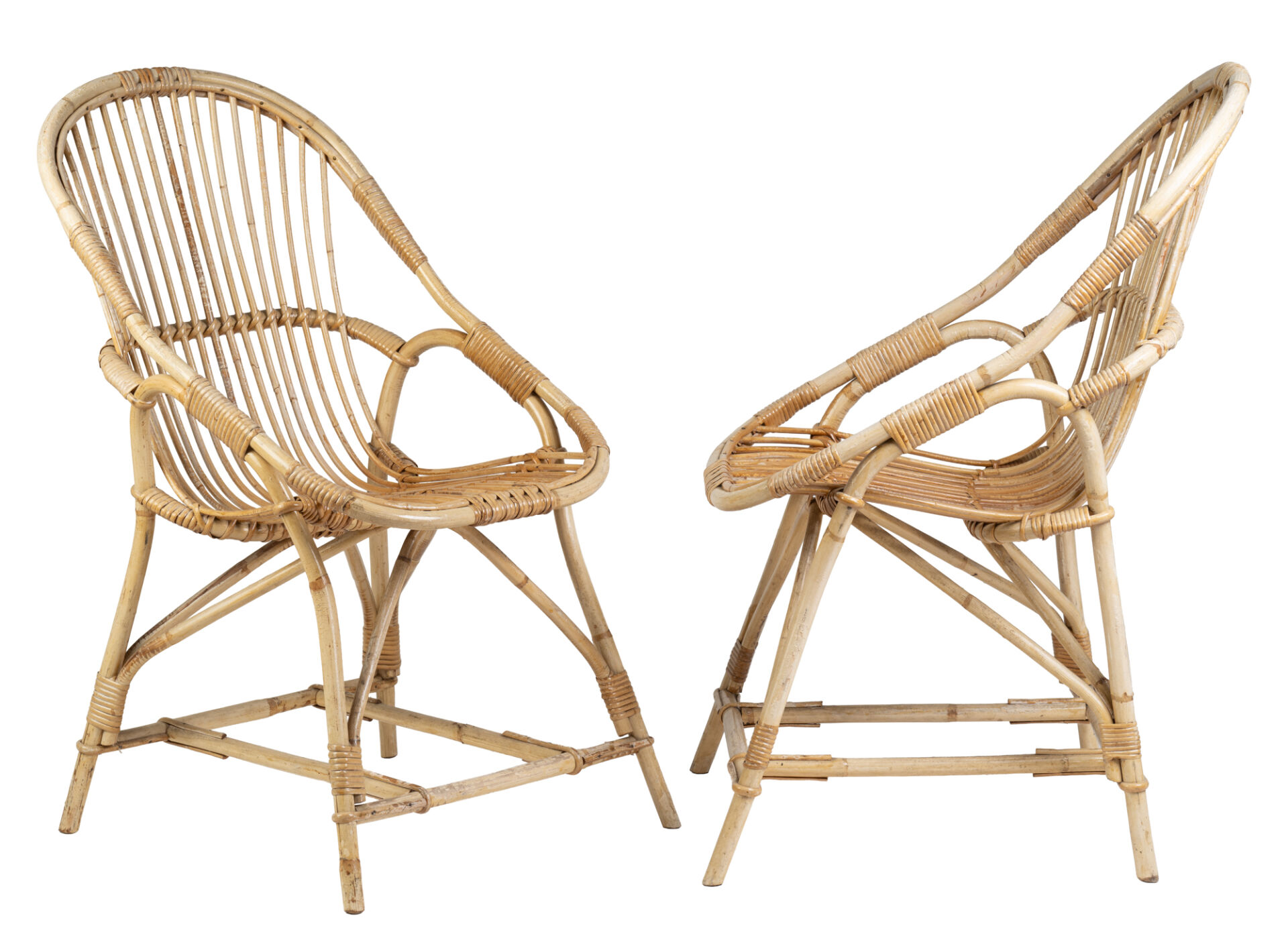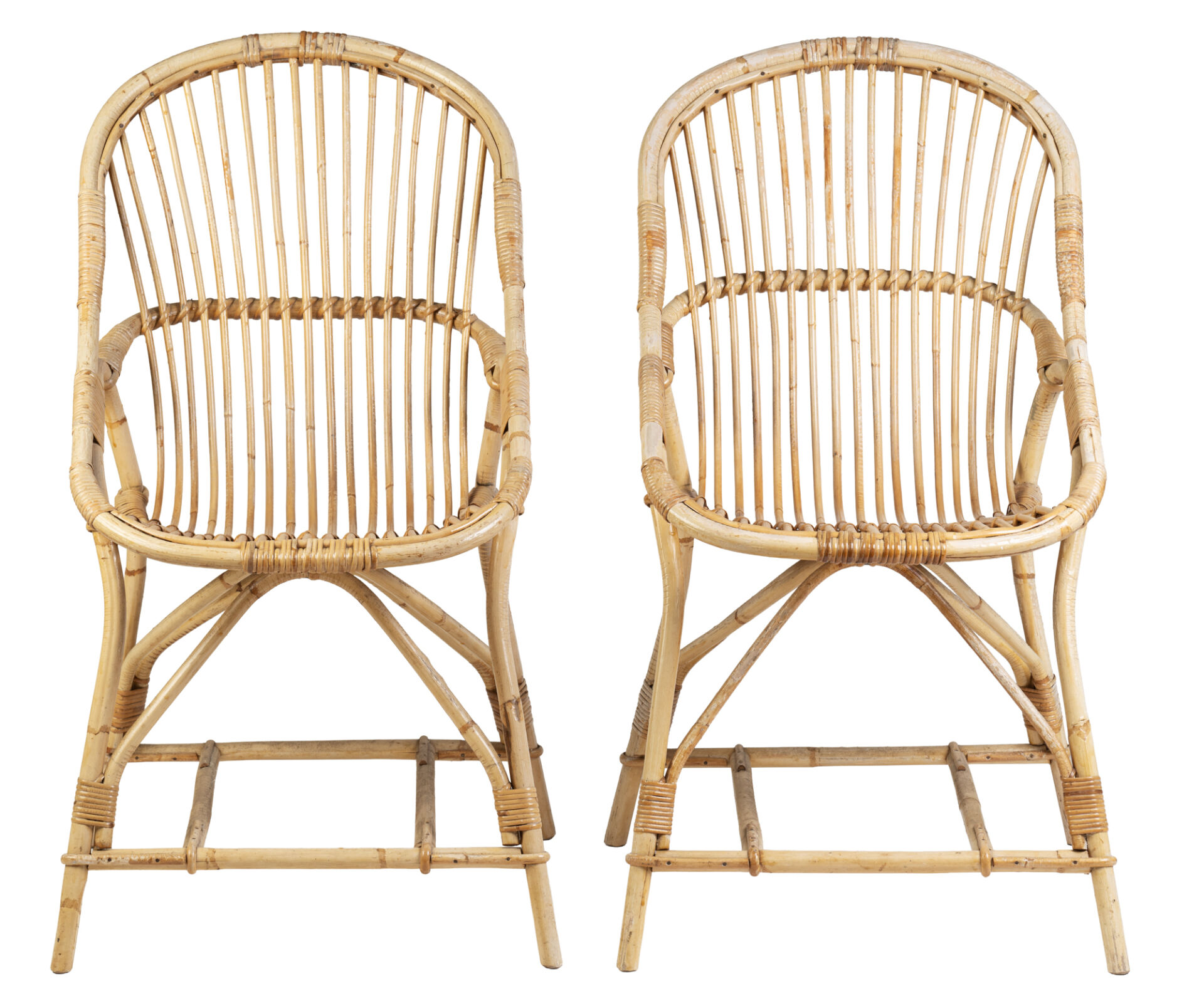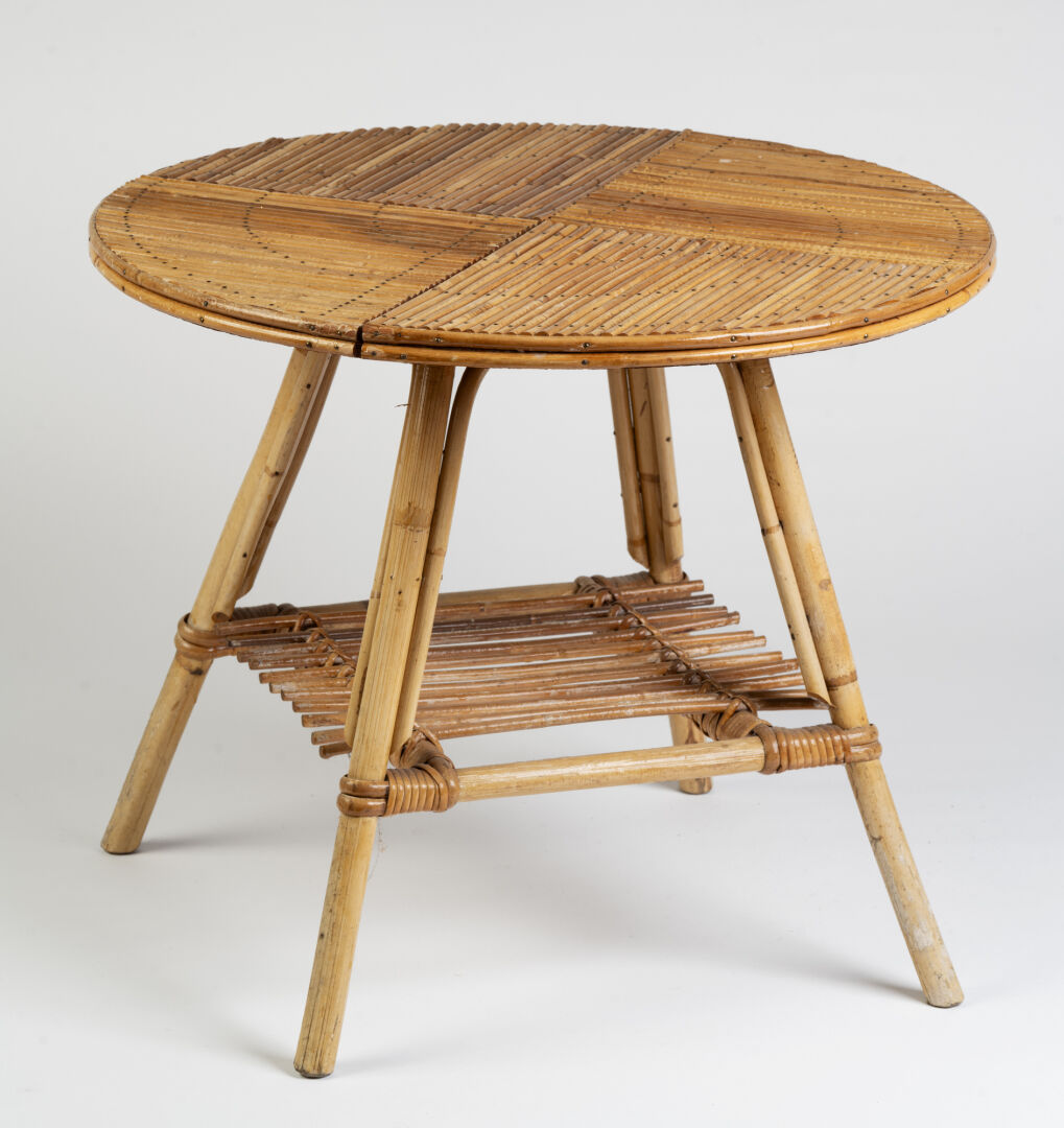 Salon en rotin composé de quatre fauteuils et d'une table basse. Vers 1960. Table : H : 49 cm ; D : 60 cm. Fauteuil : H : 89 cm ; L : 49 cm ; l : 62 cm.