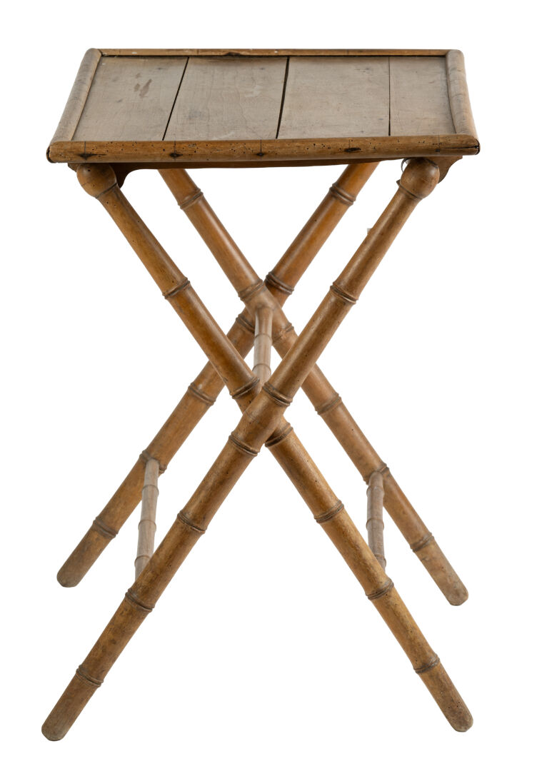 Table pliante et volante en bambou. H : 71 cm ; L : 70 cm ; l : 47 cm