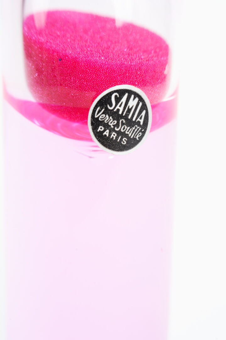 Samia, Paris. Sablier en verre soufflé rose. Vers 1970. Porte étiquette. H : 30 cm ; D : 5 cm