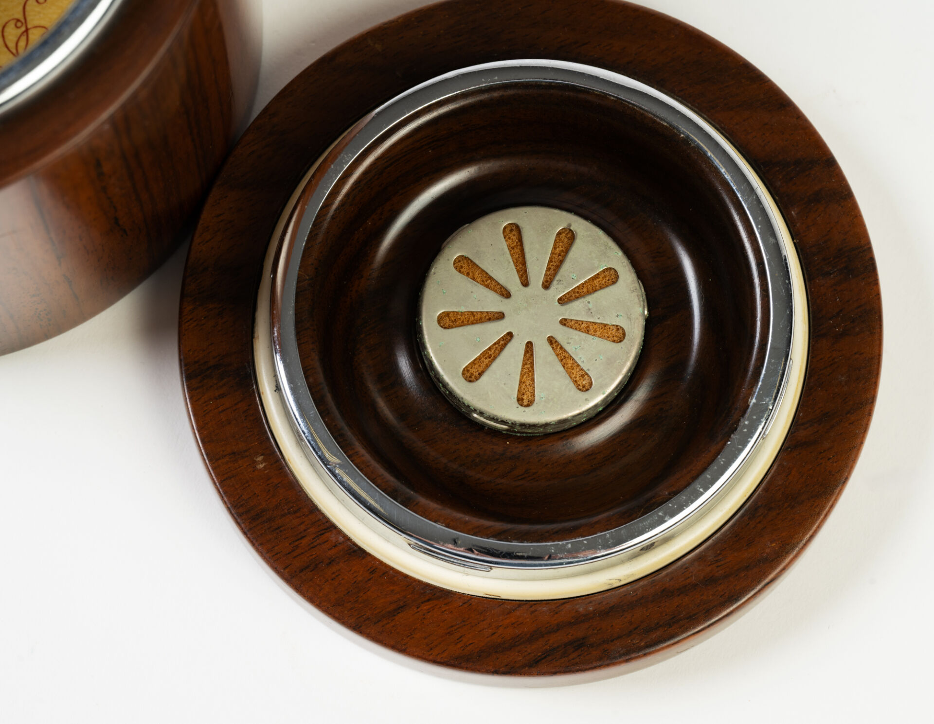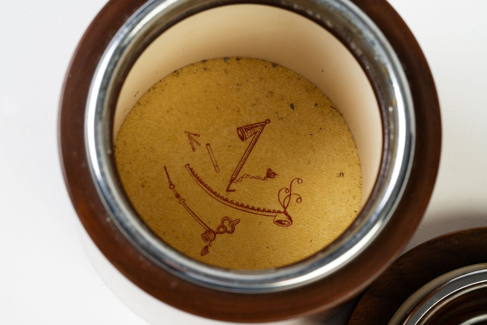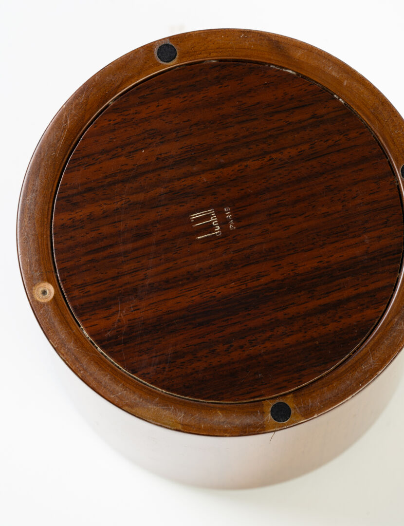 Dunhill Paris. Pot à tabac en placage d'acajou. Marqué sous la base. H : 13.5 cm ; D : 12.5 cm