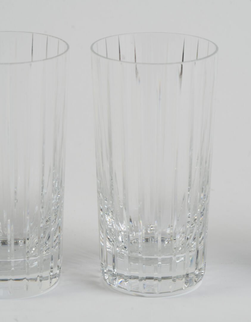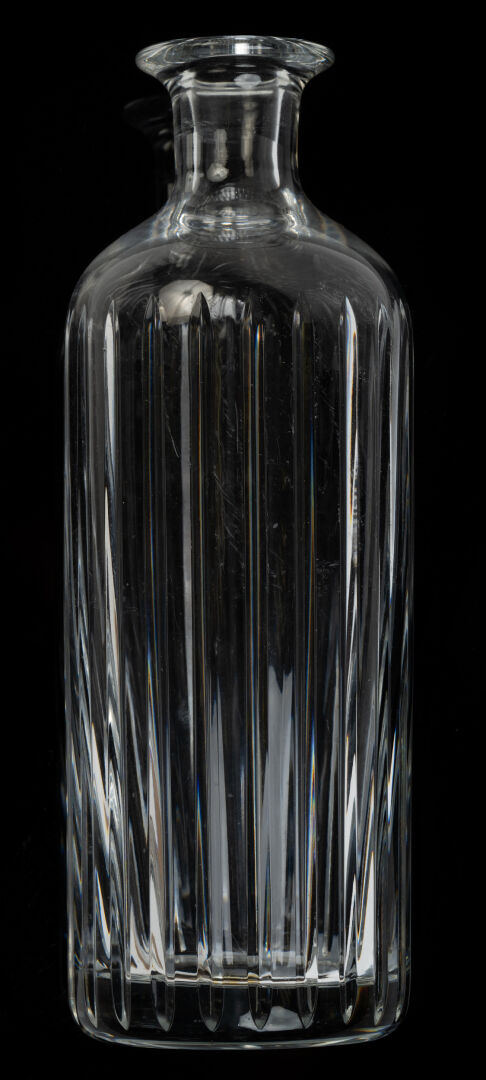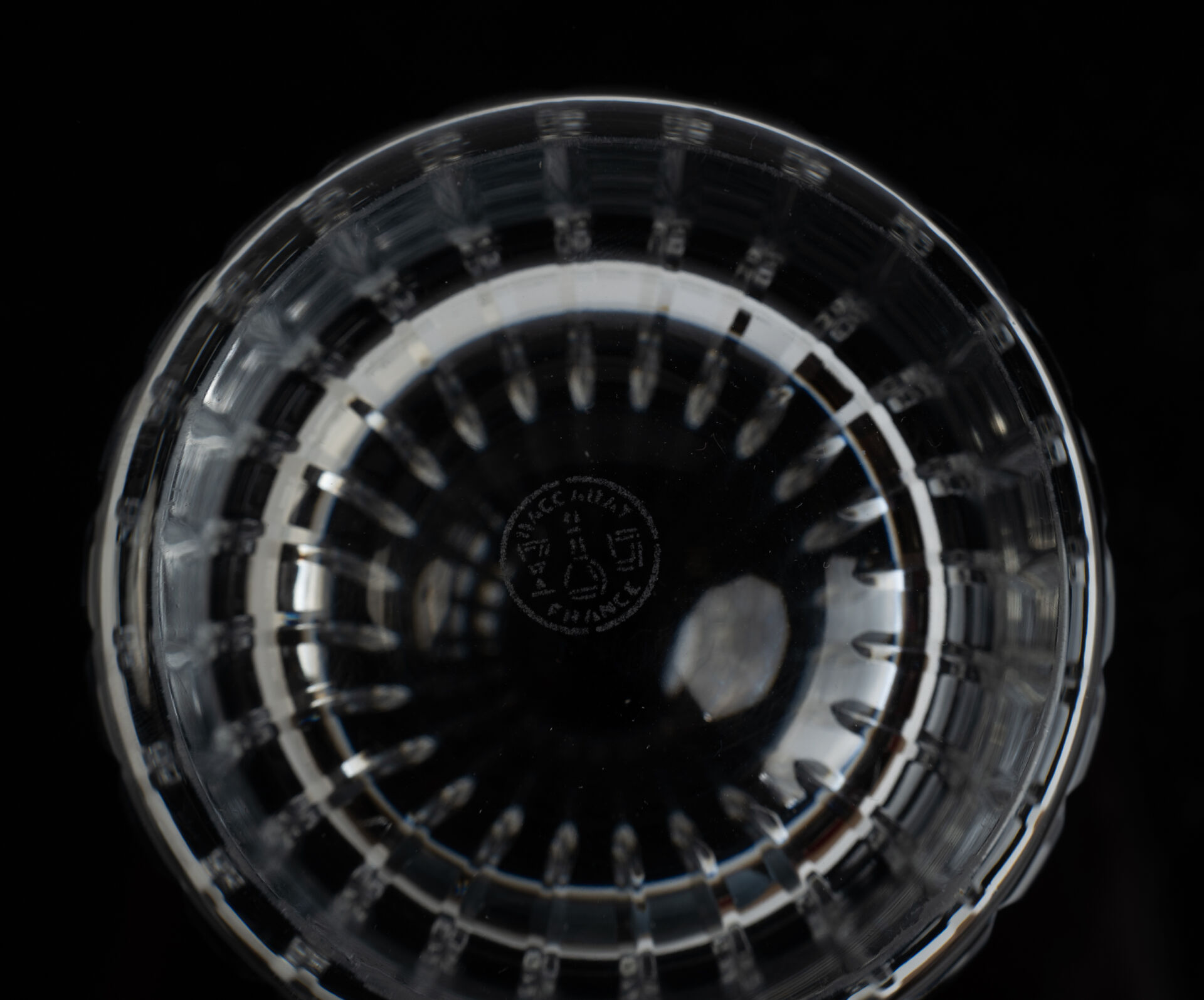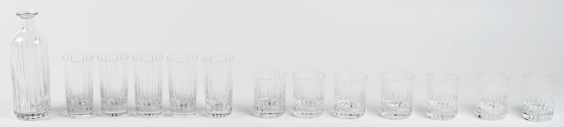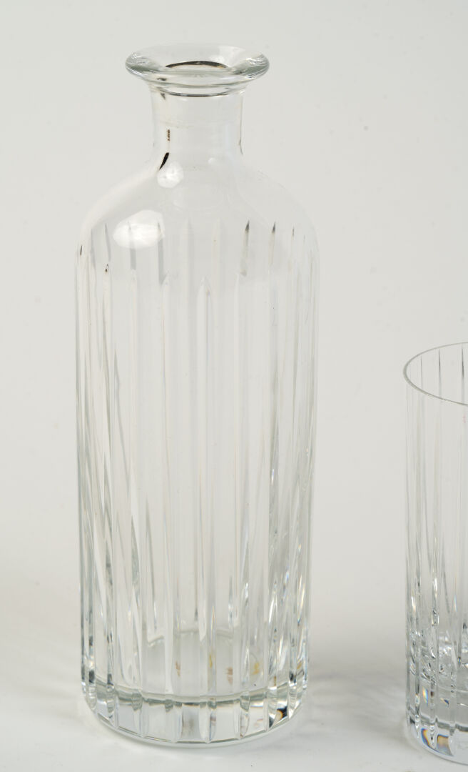Baccarat. Service à apéritif comprenant une carafe avec bouchon, cinq verres hauts et sept gobelets. Ébréchures sur trois gobelets.