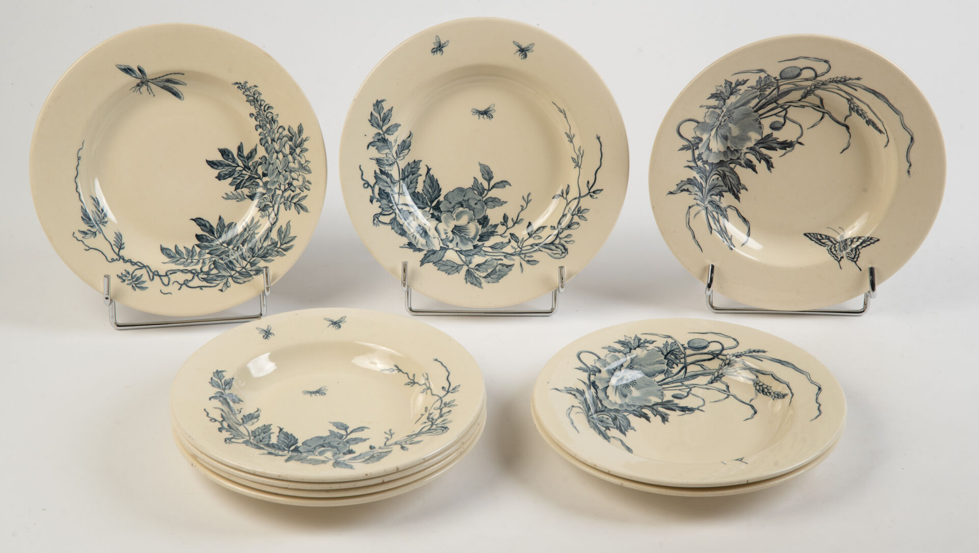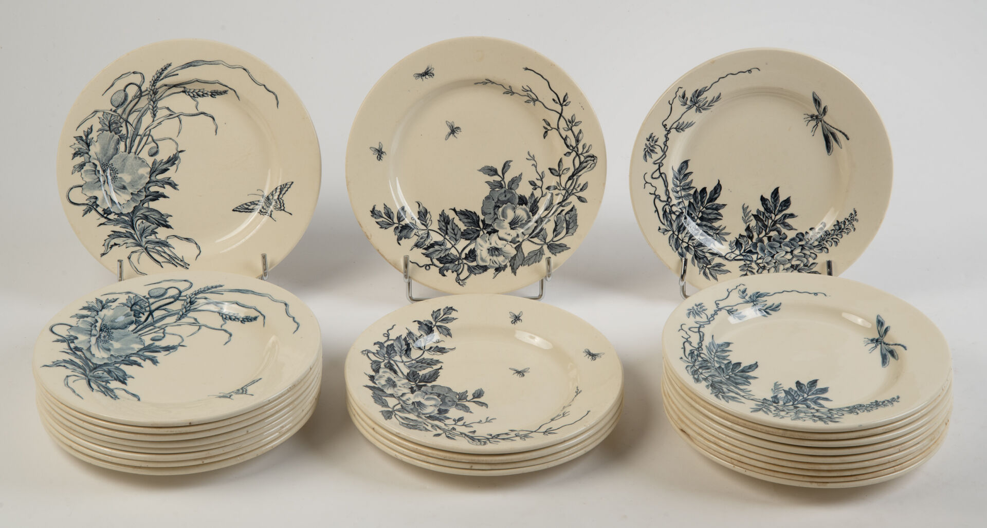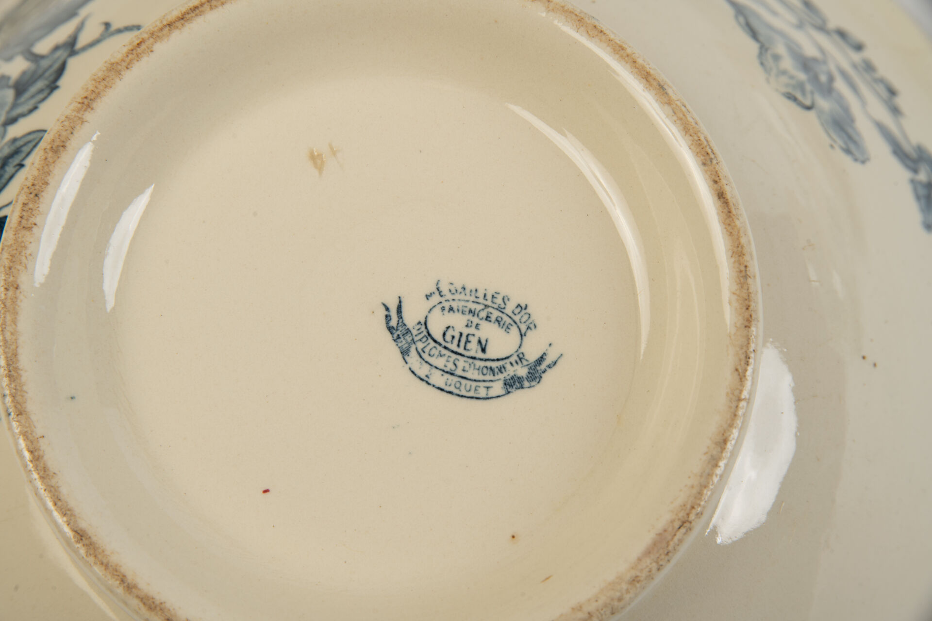 Gien. Service en faïence émaillée bleue et blanche à décor de coquelicots, de blé et de papillons. Marqué sous la base.
