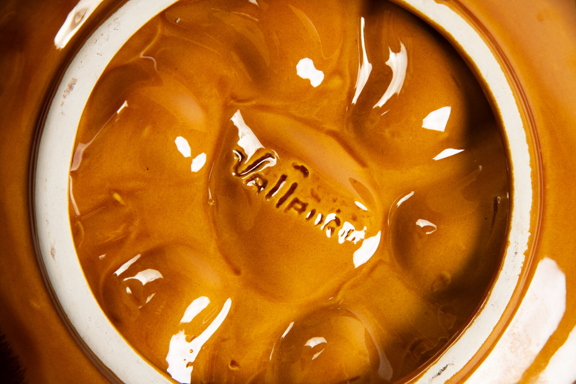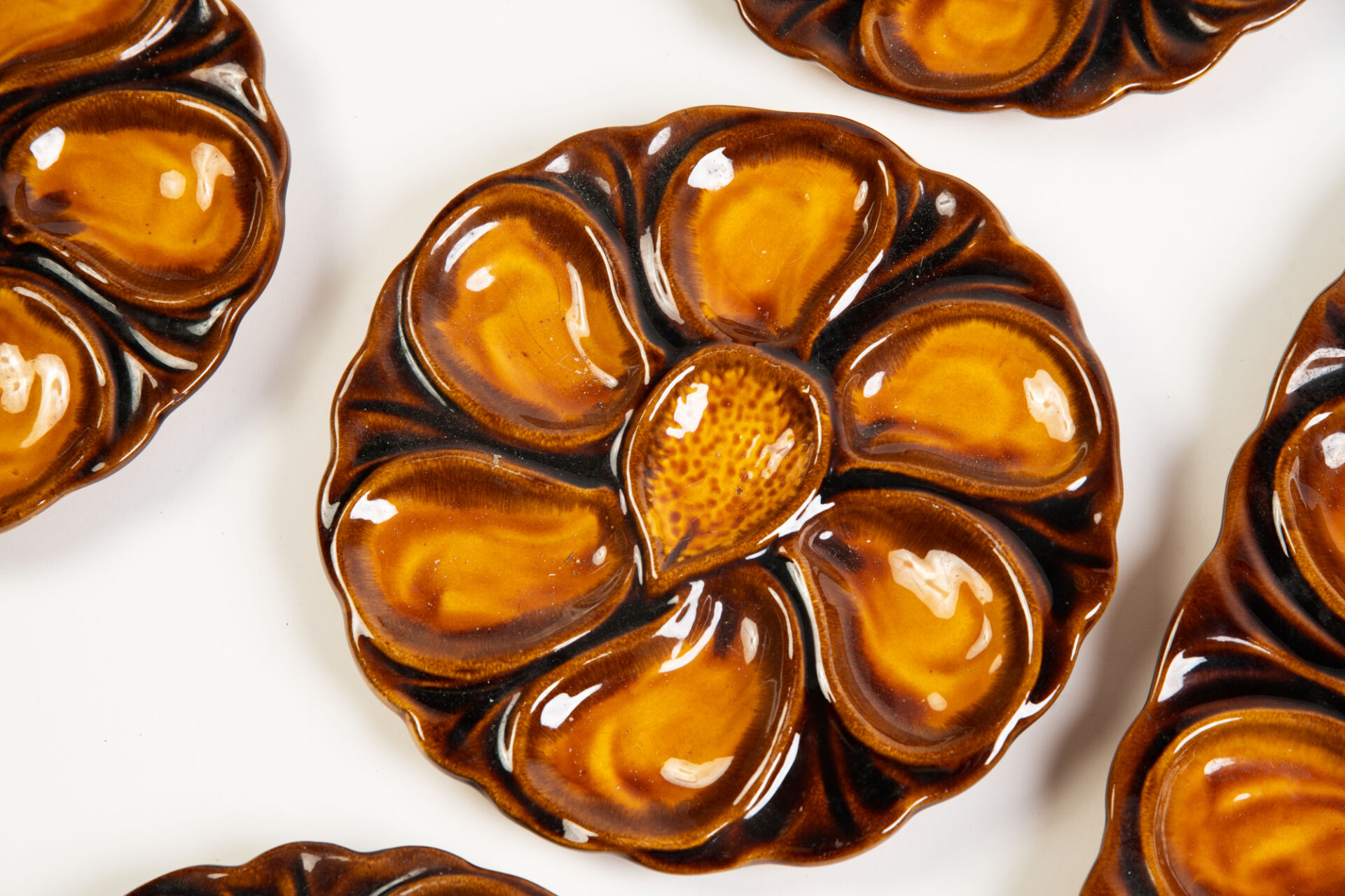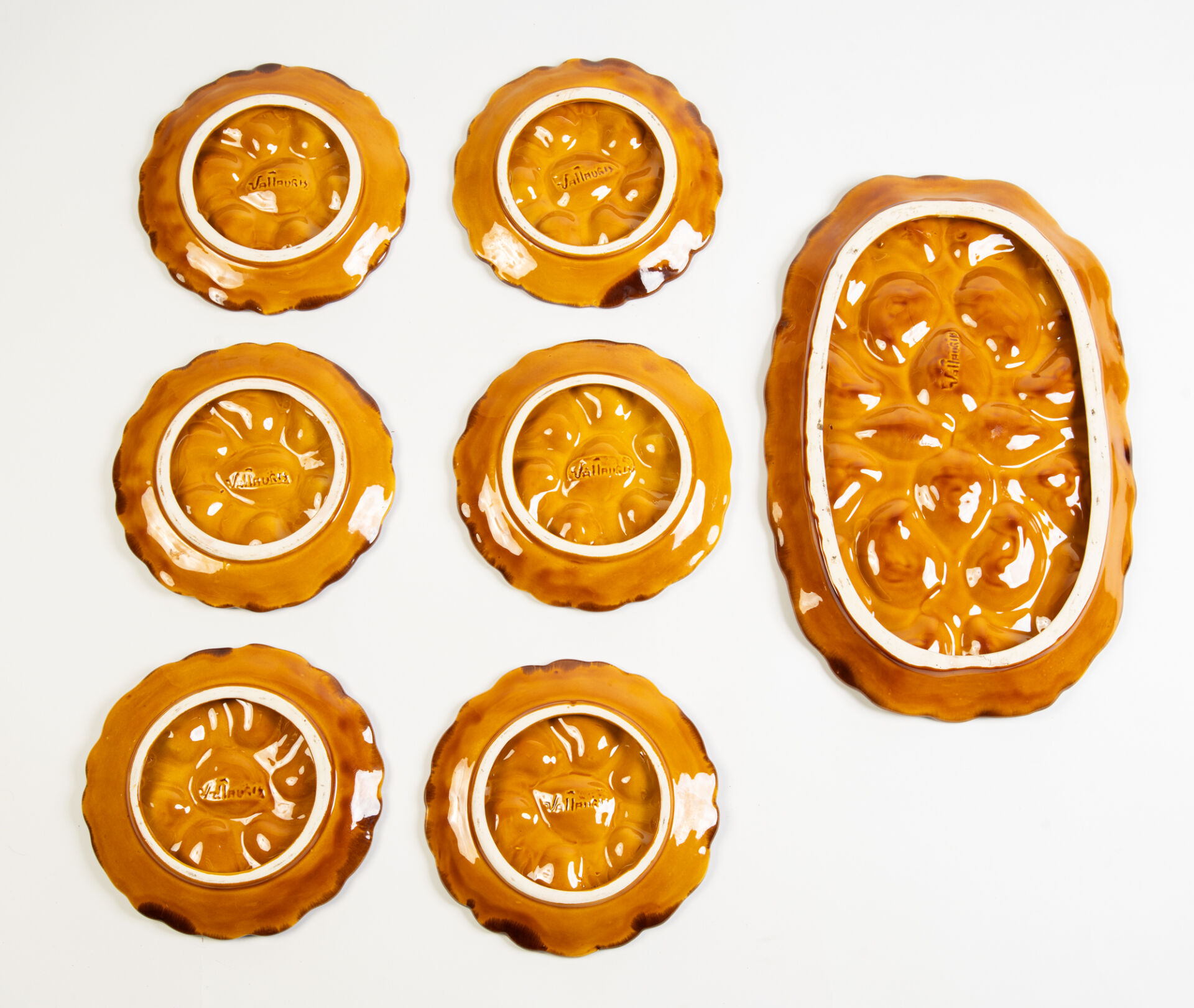 Vallauris. Service à huîtres en céramique émaillée marron et orange comprenant un plat et six assiettes. Situé sous la base. D 22 assiette : cm Plat 45 x 29 cm