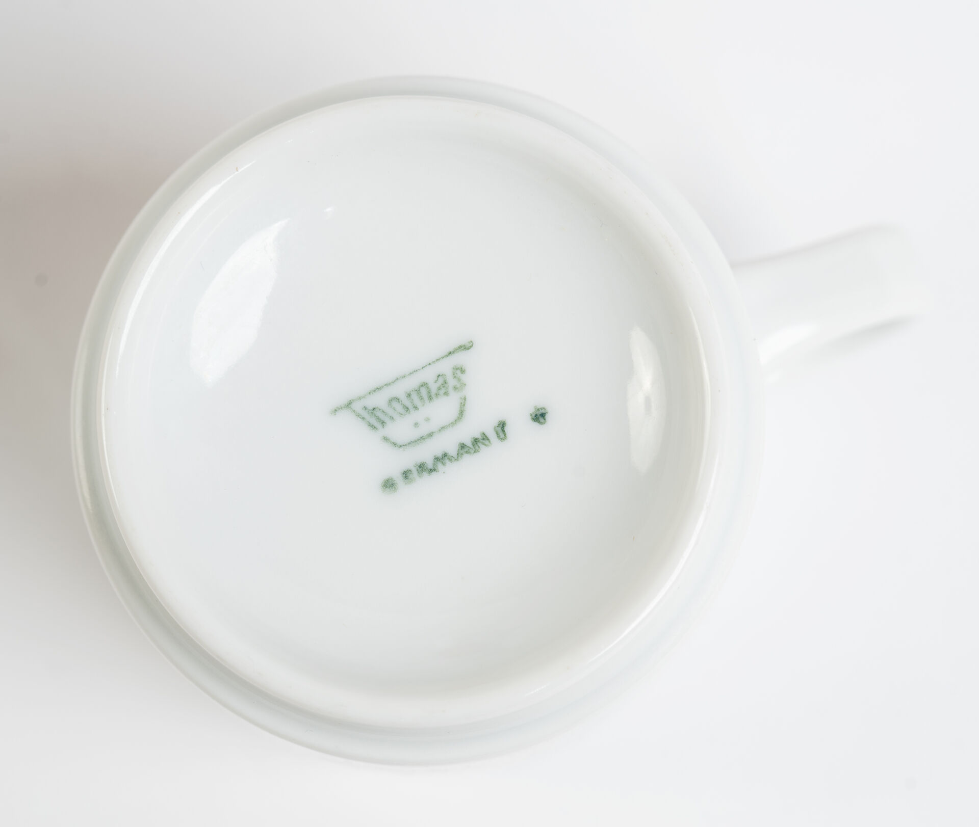 Thomas, Allemagne. Service à café en porcelaine émaillée orange et blanche à motifs graphiques comprenant une verseuse, un pot à lait, un sucrier et six tasses. Vers 1960. Verseuse : H : 21 cm ; D : 9 cm Pot à lait : H : 7 cm ; D : 6.5 cm Tasse : H : 6.5 cm ; D : 5 cm Sucrier : H : 7 cm ; D : 7 cm