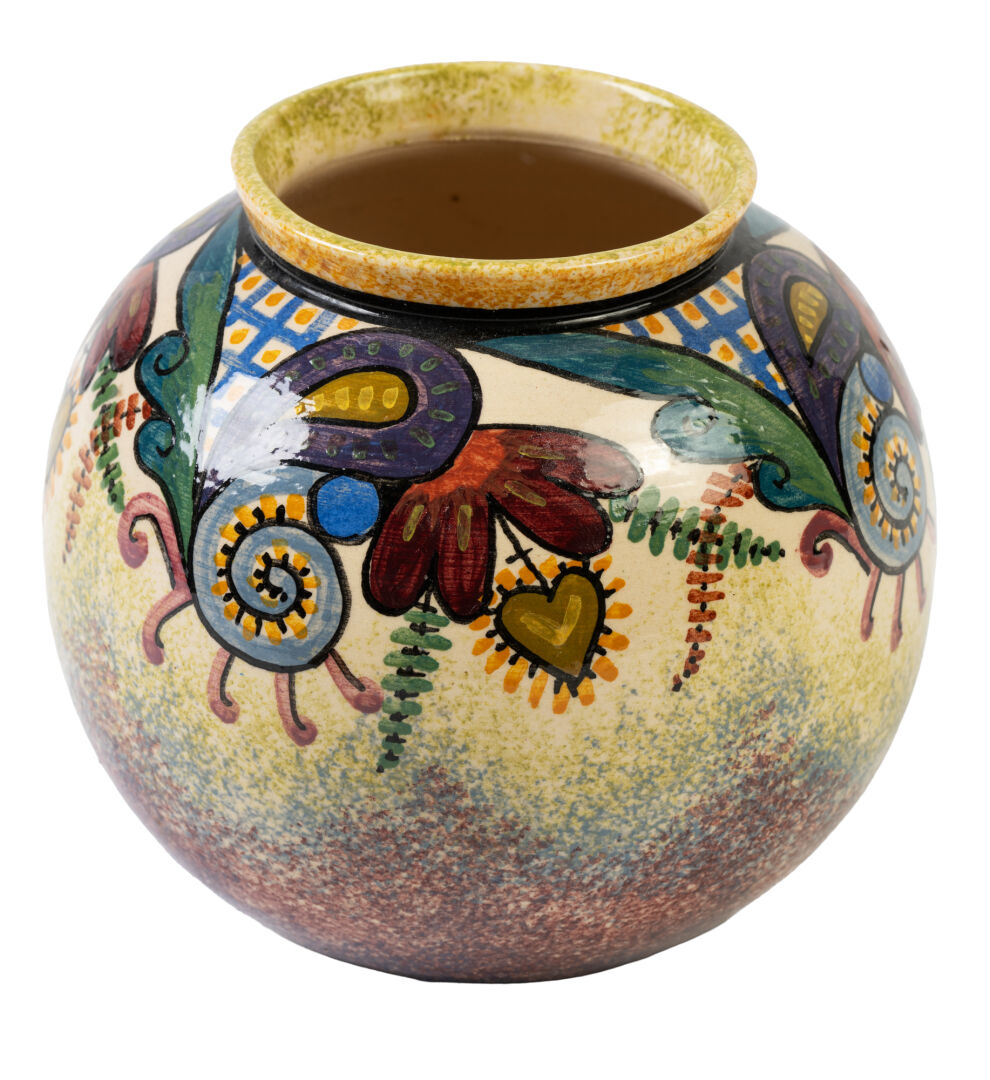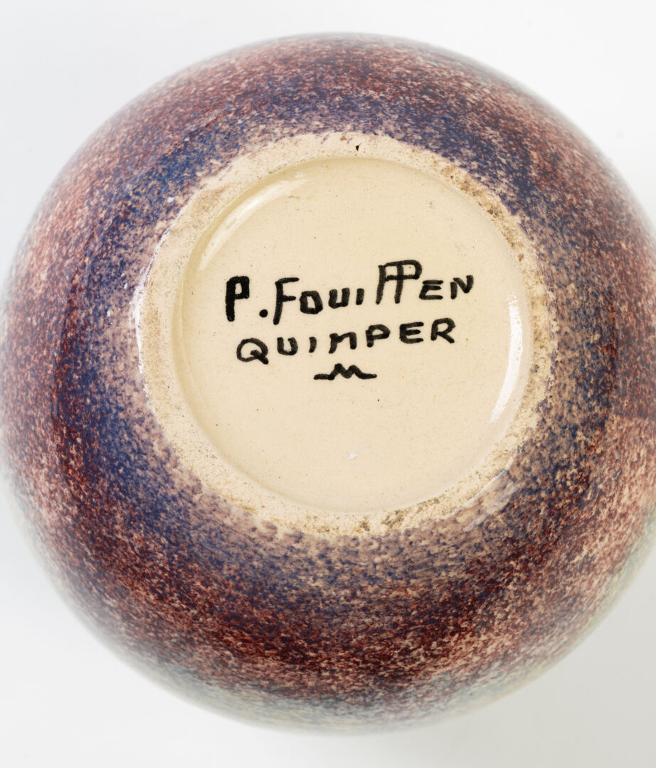 P. FOUILLEN, Quimper. Vase boule en faïence émaillée à décor de végétaux. Signé et situé sous la base. H : 13 cm ; D : 14 cm